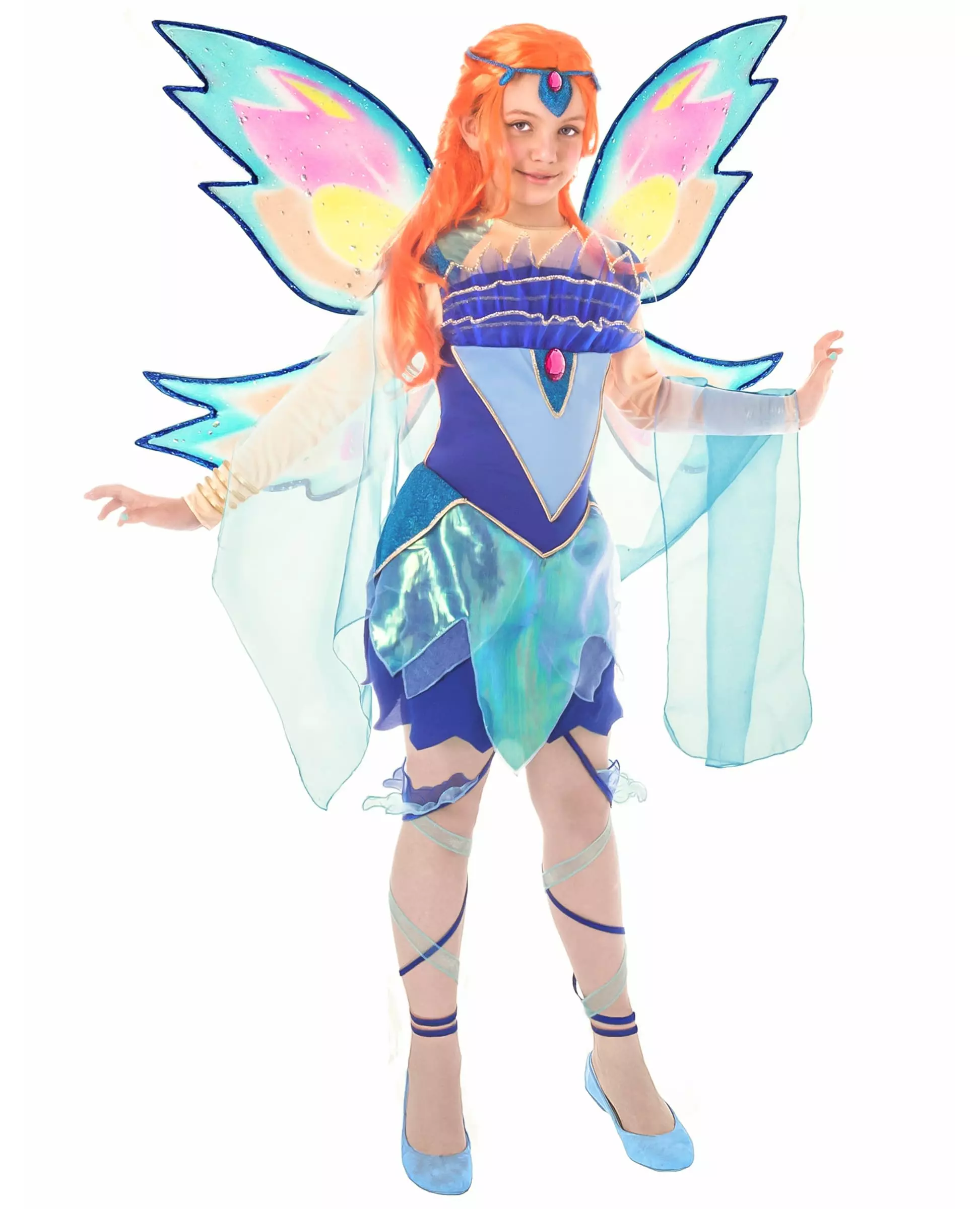 Bli medlem av Winx Club! Dette Bloom™-kostymet for barn er offisielt lisensiert av Winx Club™. Det inkluderer en kjole, vinger, et pannebånd og beinbånd. Kostymekjolen er kort og blå og lyseblå. Toppen av kjolen er dekket av tyll ved brystet og er dekorert med en rød kunstig stein. Ermene er lange og dekorert med et gjennomsiktig blått slør. Nederdelen av kjolen er mørkeblå og dekorert med flere lag lyseblått. Vingene er blå med innslag av rosa og gult, mens pannebåndet er mørkeblått og dekorert med en vakker rød kunstig stein. Kostymet fullføres av snøringen som du kan knyte rundt beina. Det er blått og dekorert med lysere tyll. Bli med på Winx Club-teamet med dette Bloom-kostymet til karneval!. Inkludert tilbehør: Kjole Vinger Pannebånd Benbånd Materiale: 100 % polyester Vedlikehold: Håndvask