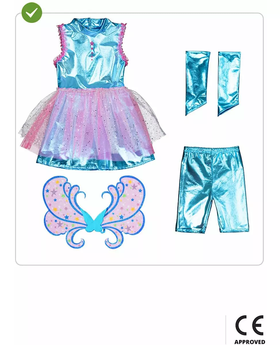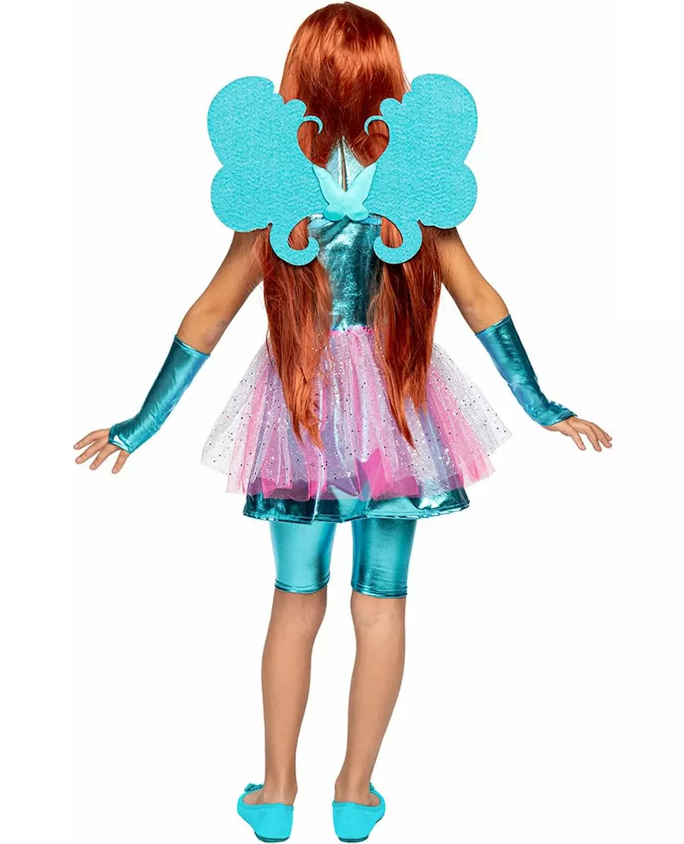 Tre inn i Winx™-land! Dykk ned i Winx™-magien og bli Bloom, ildfeen, med dette fantastiske kostymet for jenter! Dette fortryllende kostymet fanger perfekt ånden til denne modige og bestemte heltinnen, klar til å ta barnet ditt med på fantastiske eventyr. Antrekket består av en kjole med glitrende blå refleksjoner, forsterket av et skinnende rosa tyllskjørt som gir et snev av magi. De matchende lange ermene gir hele antrekket et elegant og magisk utseende. Et par skinnende blå bukser fullfører utseendet samtidig som det gir komfort og bevegelsesfrihet slik at den lille feen kan løpe og leke uten begrensninger. Til slutt gir de rosa paljettbesatte vingene et lyst og majestetisk preg, som minner om Blooms magiske kraft. Ideelt for karneval, kostymefester eller temabursdager, vil dette kostymet gjøre barnet ditt til den sanne Winx™-heltinnen, klar til å redde verden med stil og magi. Inkludert tilbehør: 1 kjole 1 mansjetter 1 par bukser 1 par vinger Materiale: 100 % polyester Vedlikehold: Håndvask
