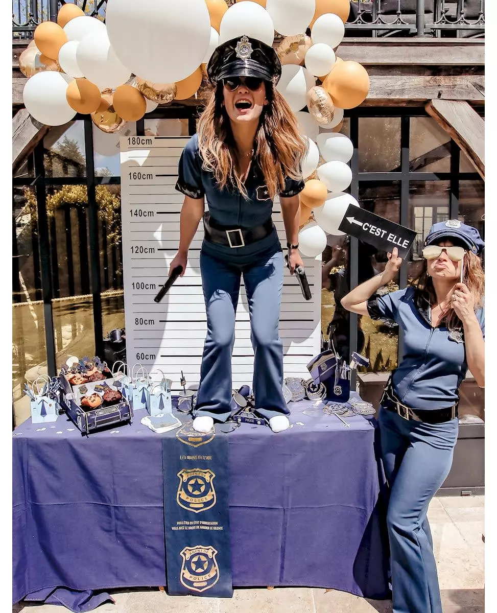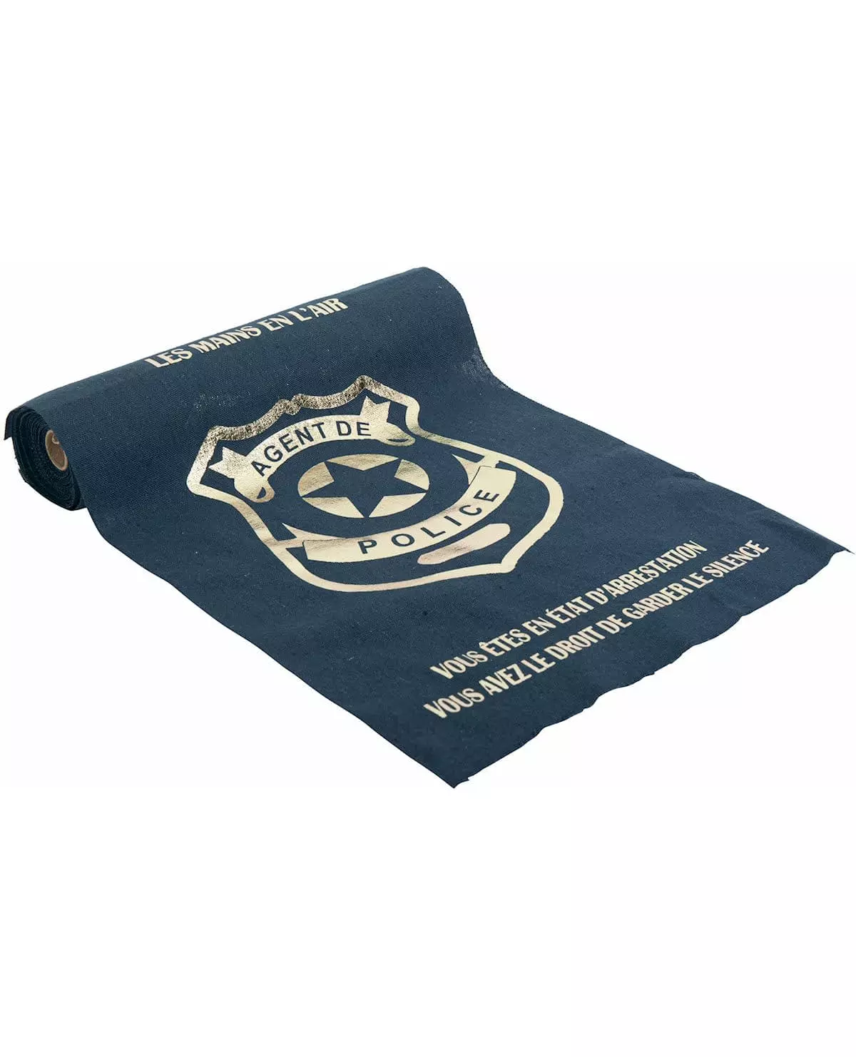 En perfekt dekorasjon for en spirende politibetjent! Denne bordløperen er marineblå med et gullfarget politimerkedesign. Den har også setningene «Hendene opp» og «Du er arrestert, du har rett til å tie». Den måler omtrent 3 m x 28 cm. Fullfør din politiinspirerte borddekorasjon til en bursdag! Inkludert tilbehør: 1 bordløper Materiale: Lin