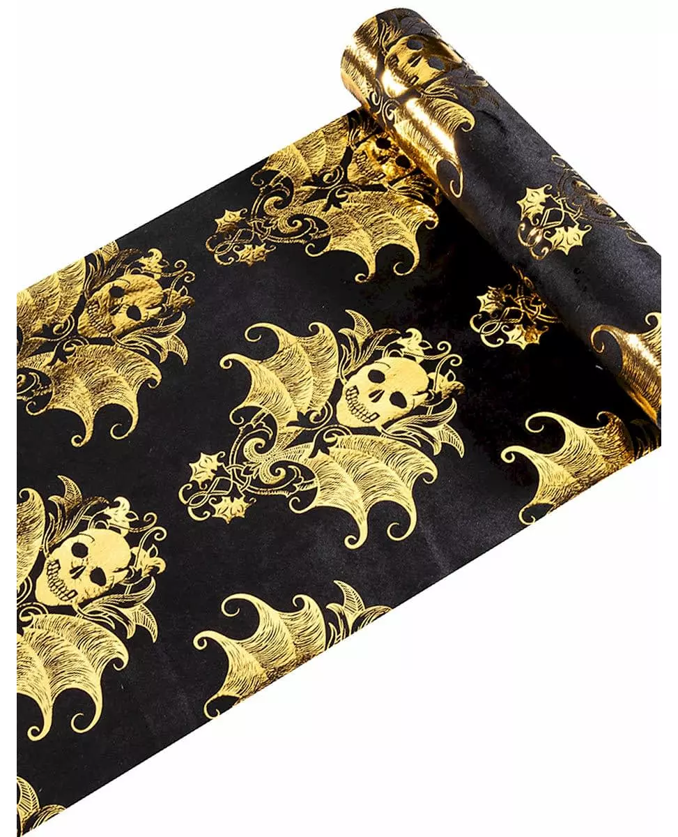 Et snev av makaber eleganse til Halloween-borddekorasjonen din! Denne borddekorasjonen forestiller en skjelettlignende bordløper og måler omtrent 3 m lang og 23 cm bred. Laget av svart fløyel overalt, er den preget av ornamenter formet som gylne hodeskaller i en vakker barokkstil. Kontrasten mellom de to fargene vil gjøre bordet ditt til det vakreste om kvelden! Denne bordløperen vil være ideell for å perfeksjonere borddekorasjonen under Halloween-festen! Inkludert tilbehør: 1 bordløper Materiale: Fløyel Vedlikehold: Håndvask