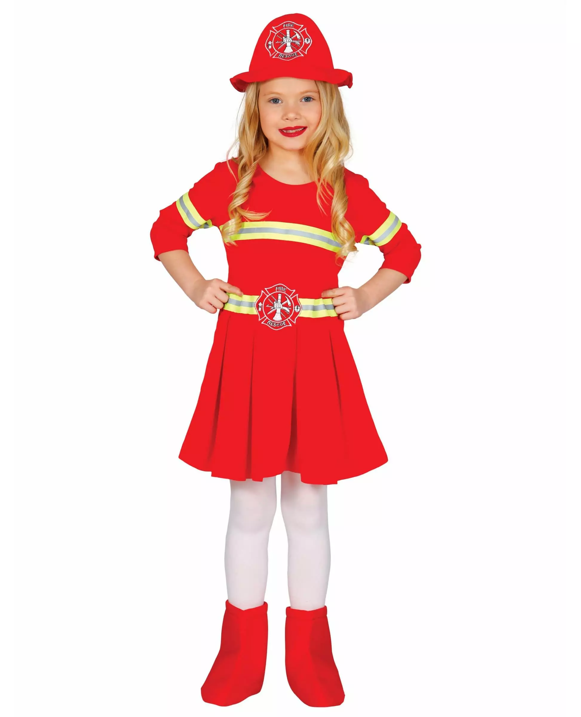 Brannmenn, ild! Dette brannmannkostymet for jenter består av en kjole og en hatt (strømpebukser og sko er ikke inkludert). Kjolen har 3/4-ermer og er rød. Den er dekorert med fosforescerende striper foran og på ermene, samt et brannmannmerke foran. Den lukkes bak med borrelås. Den røde hatten er dekorert med samme merke som kjolen. Dette kostymet vil være perfekt for å forvandle datteren din til en brannmann på karnevalet! Inkludert tilbehør: Dresshatt Materiale: 100 % polyester Pleie: Håndvask