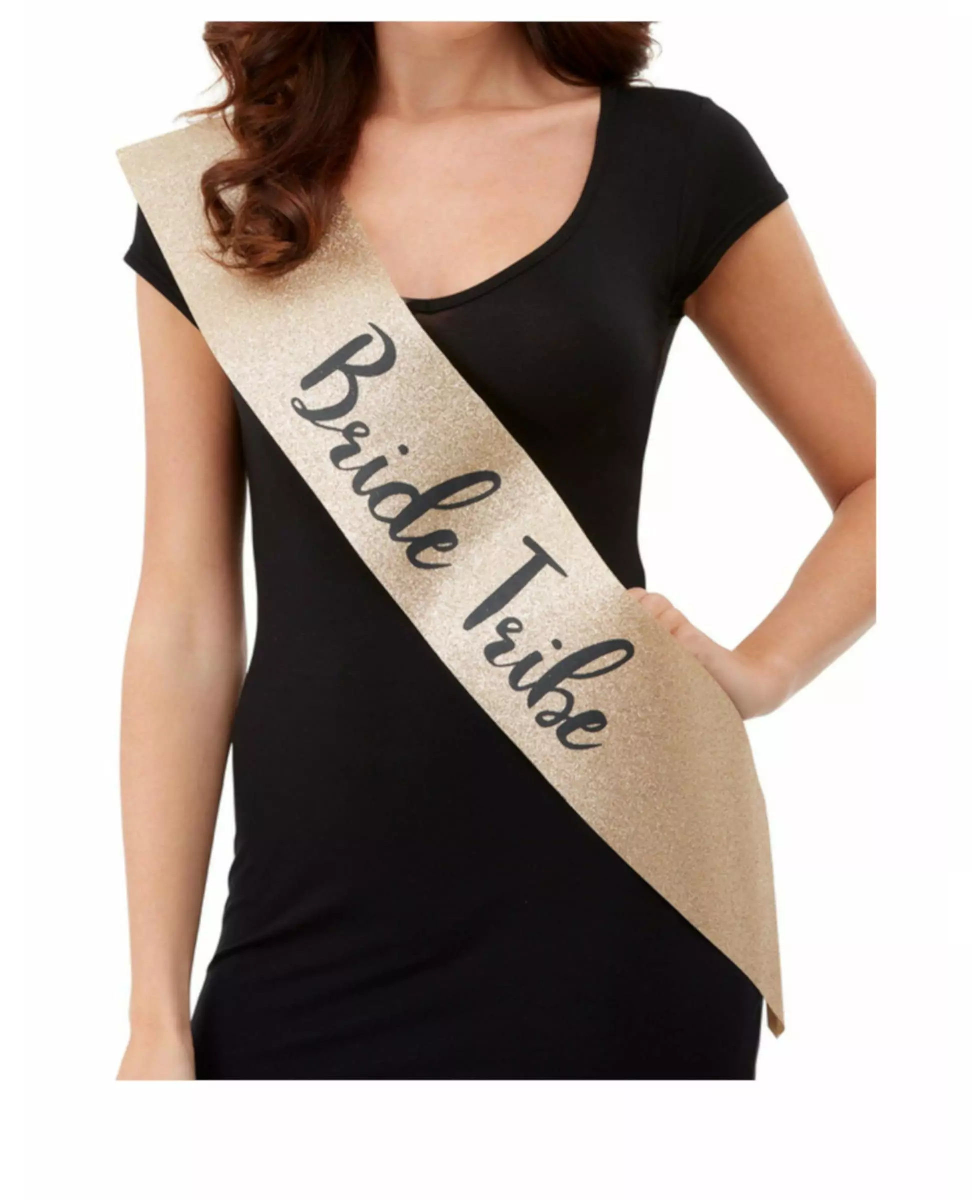 Bli med på brudens lag! Dette gullfargede beltet er for voksne. Meldingen «Bride Tribe» er trykt i svart på beltet. Dette beltet bæres som et ugift belte. Det vil være perfekt for å bli med på brudens lag ved slutten av et enslig liv. Inkludert tilbehør: Belte Materiale: 100 % polyester