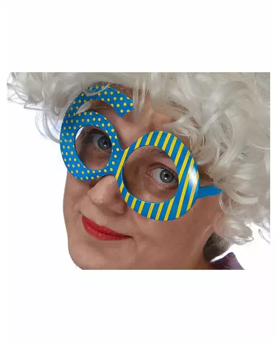 Vær kitsch til din 60-årsdag! Disse brillene er for voksne. De er laget av stiv plast og er turkise med gule striper og prikker. De representerer tallet «60» og måler omtrent 14 cm i lengden. Disse brillene vil være det essensielle tilbehøret for å feire din 60-årsdag. Inkludert tilbehør: Briller Materiale: Plast
