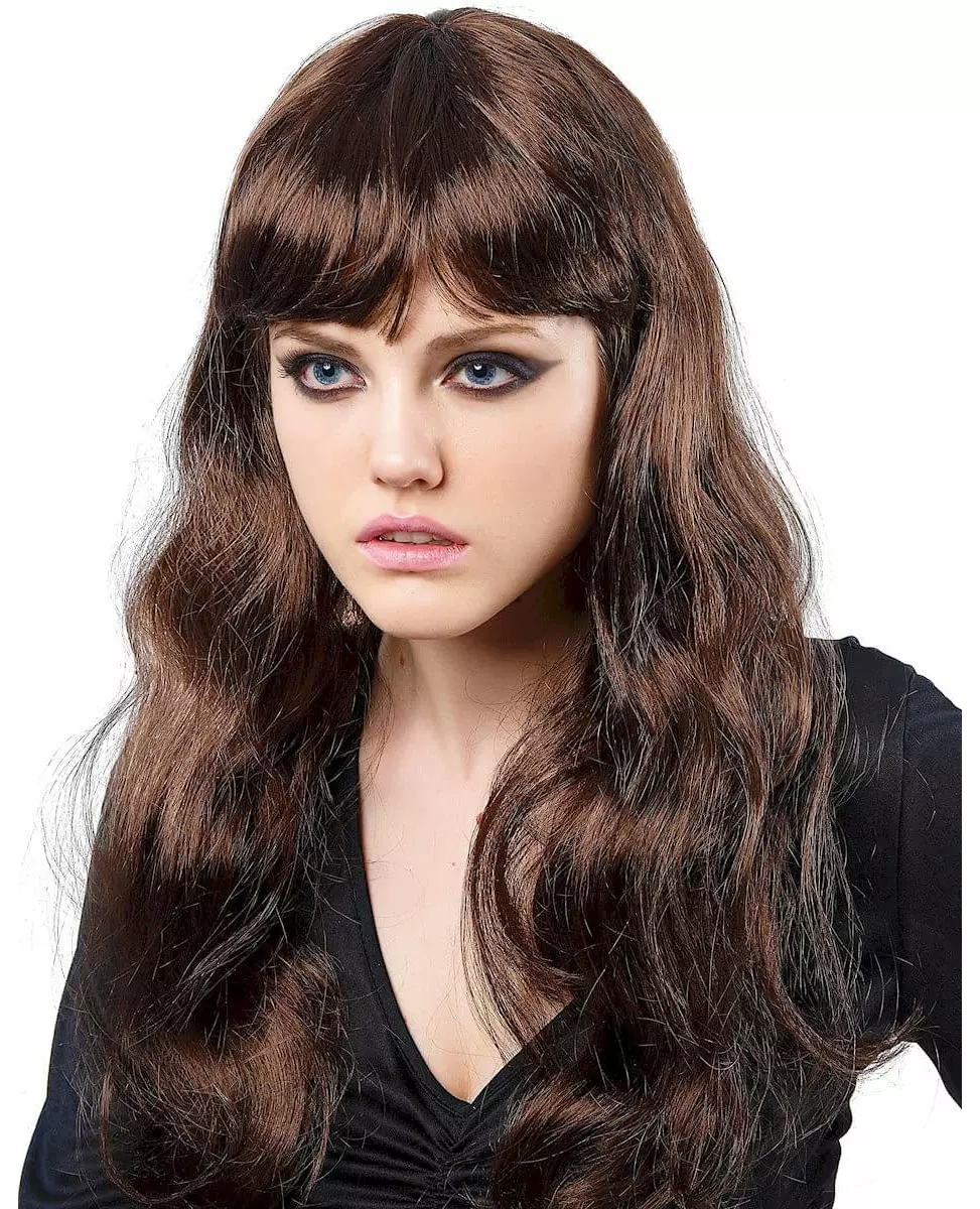 Endre frisyren din umiddelbart Denne parykken for kvinner er realistisk. Det syntetiske håret er langt og bølget. En brun lugg fullfører denne parykken. Hvis du vil endre utseendet ditt eller fullføre et kostyme, vil denne kastanjefargede parykken være perfekt for å forvandle deg. Inkludert tilbehør: Parykk Materiale: 100 % polyester 100 % polyester Stell: Håndvask