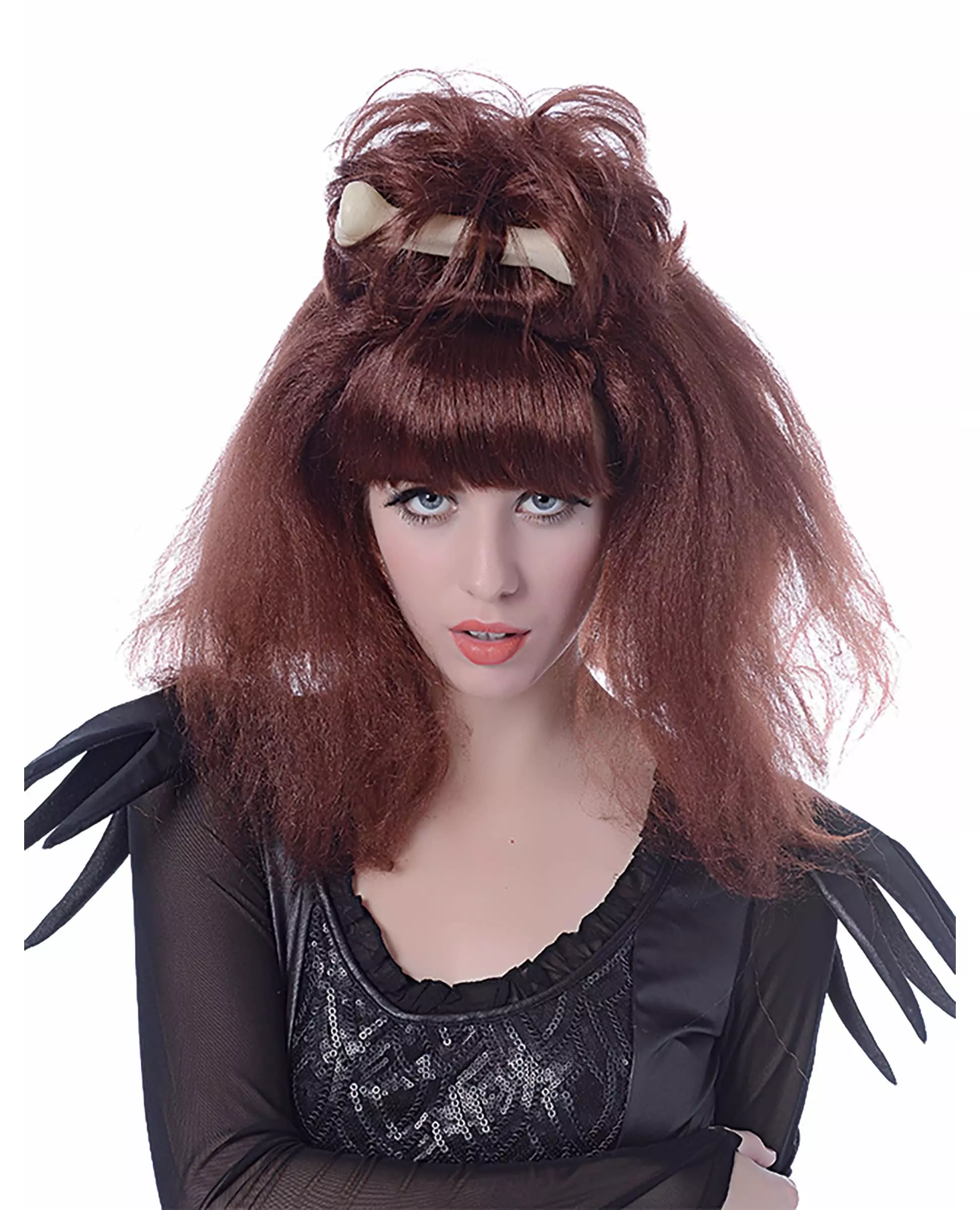 Bli en ekte hulekvinne. Denne brune parykken for kvinner har langt, rufsete hår. En hestehale er plassert på toppen av hodet, med et plastbein ved bunnen. Denne parykken har også en lang lugg med rett hår samt kobberdetaljer. Dette tilbehøret vil være perfekt for å fullføre et hulekvinnekostyme til en forhistorisk fest. Inkludert tilbehør: Parykk. Materiale: Syntetisk.