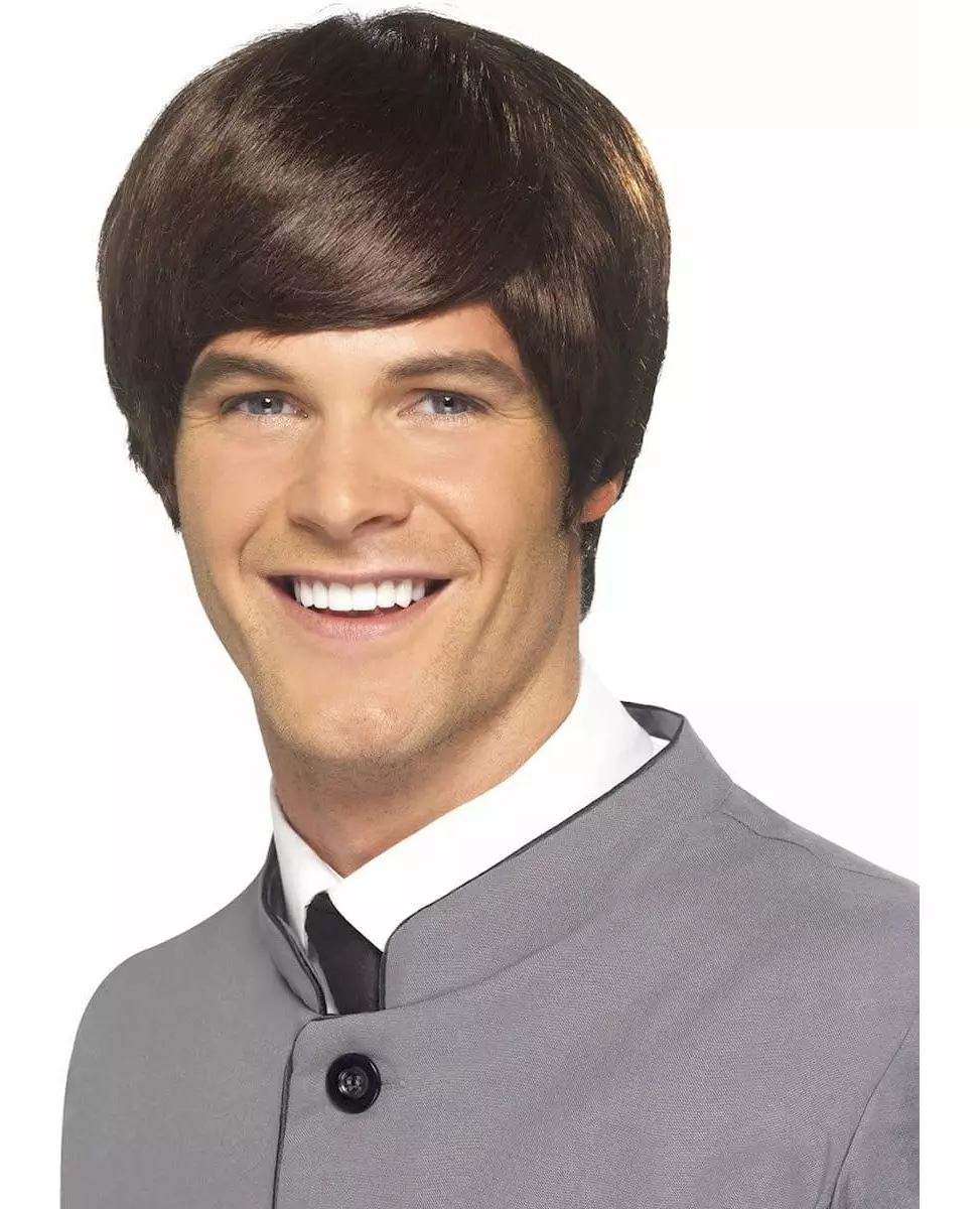 Få et vintage-utseende Denne brune 60-tallsparykken for menn er brun i fargen. Den har en kort lugg med bevegelse på siden. Dette tilbehøret vil være perfekt for å fullføre et retrokostyme på en 60-tallsfest. Inkludert tilbehør: Parykk Materiale: Syntetisk