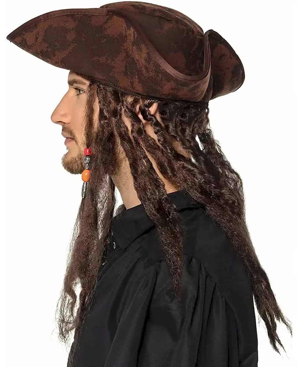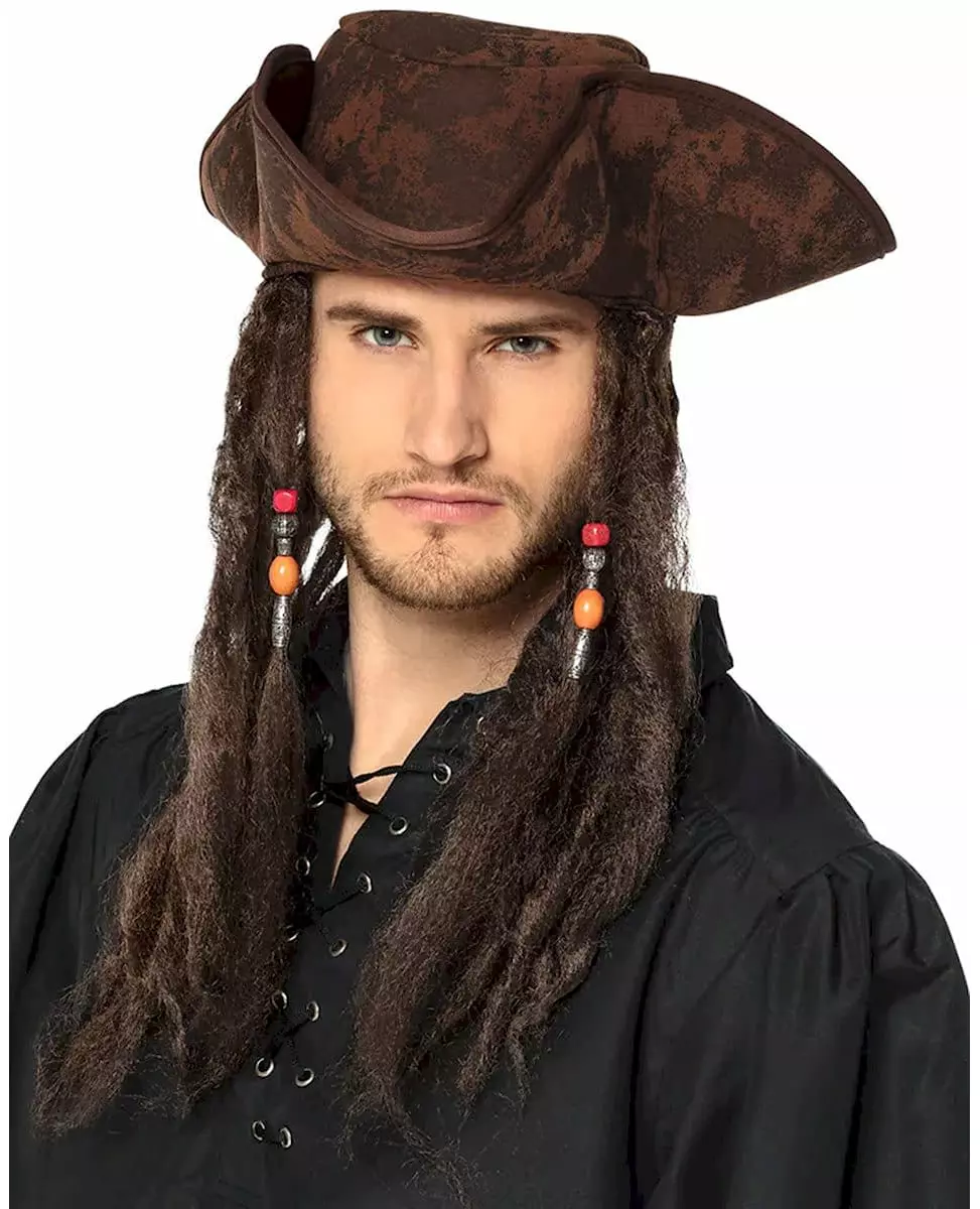 Et piratutseende som er mer ekte enn livet Denne brune pirathatten av høy kvalitet med en aldret effekt er det perfekte tilbehøret for å legemliggjøre en legendarisk sjørøver. Den er dekorert med tykke tråder festet rett under bremmen, med fargede perler for et mer ekte utseende. Takket være den bearbeidede finishen og den bevisst slitte stilen, gir denne hatten autentisitet til kostymet ditt. Perfekt for et karneval, en pirattemafest eller enhver annen anledning der eventyr står på spill. Inkludert tilbehør: 1 hatt Materiale: 100 % polyester Stell: Håndvask