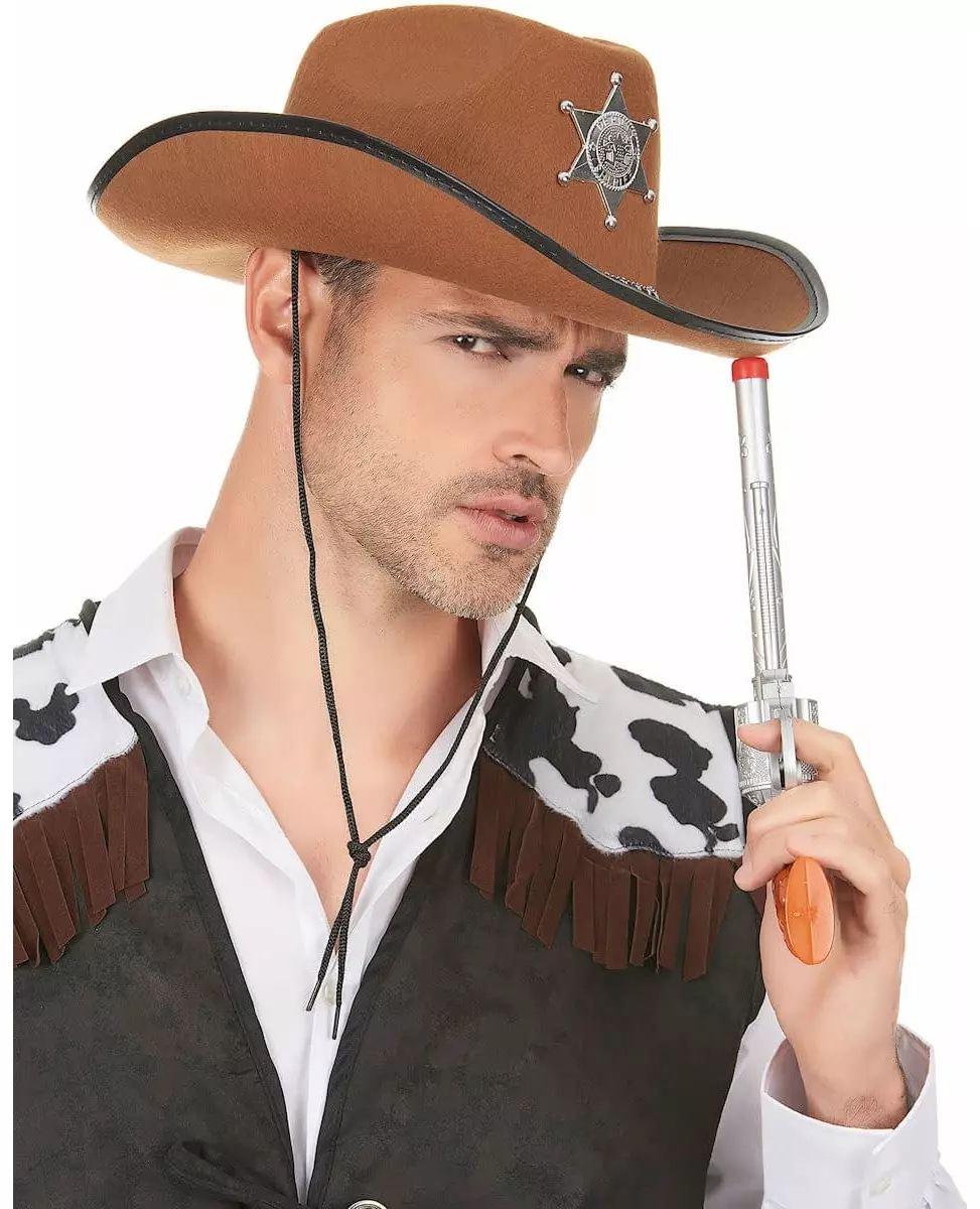 Western-tema! Denne cowboyhatten er for voksne. Brun i fargen og laget av stivt materiale, et sølvfarget sheriffmerke er limt foran. Hodeomkretsen måler omtrent 59 cm. Denne hatten er ideell for ethvert kostymearrangement som tilbehør til et cowboykostyme! Inkludert tilbehør: Hattmateriale: 100 % polyester 100 % polyester