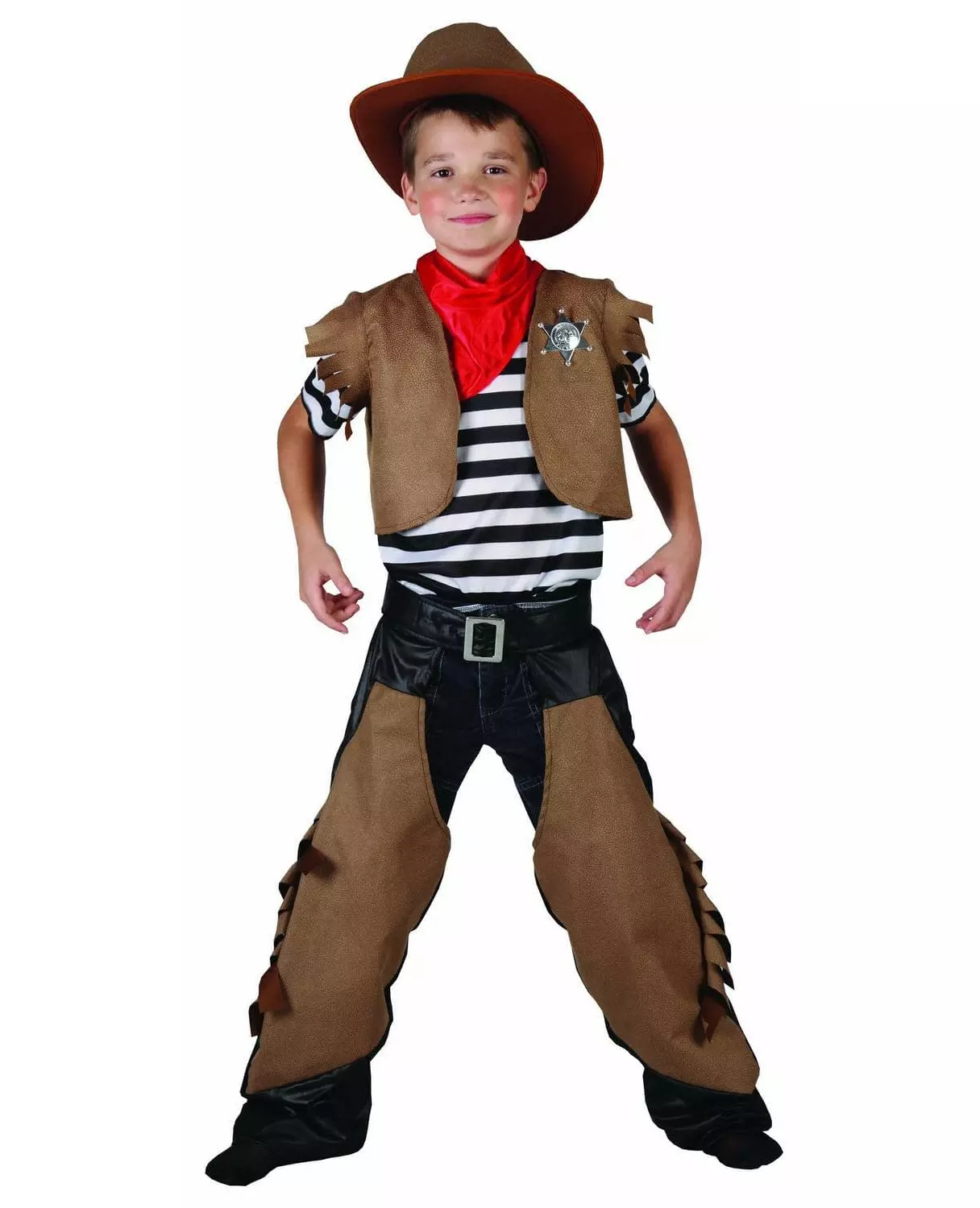 Av gårde til Ville Vesten! Dette cowboykostymet for gutter består av en vest, overtrekksbukser, en hatt og et skjerf. Vesten er i brunt kunstskinn og har små ermer kuttet i frynser. En sølvstjerne er også festet på venstre side. Overtrekksbuksene er også i brunt kunstskinn foran med frynser på sidene. Bak er den svart, i likhet med beltet den er festet til. Det samme beltet har en sølvspenne. Kostymet inkluderer også et rødt skjerf til å knyte rundt halsen, samt en brun hatt i kunstskinn (T-skjorte ikke inkludert). Dette settet vil være ideelt for å gjøre barnet ditt til en perfekt liten cowboy til karneval eller andre utkledningsarrangementer. Inkludert tilbehør: Vest Overtrekksbukser Hatt Skjerf Materiale: 100 % polyester Vedlikehold: Håndvask