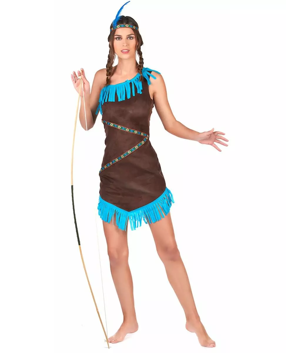 Klar for regndans! Dette indiske kostymet for kvinner består av en kjole og et pannebånd (halskjede og spyd er ikke inkludert). Den mellomlange kjolen er asymmetrisk på skuldrene. For å sikre at kjolen holder seg på plass, er det sydd en gjennomsiktig og justerbar stropp på høyre skulder. Nederdelen av kjolen og langs halsutringningen er dekorert med turkise frynser. Resten av stoffet, brunt i fargen, minner om semsket skinn. En frise med etniske mønstre pryder forsiden av kjolen og fremhever silhuetten. Pannebåndet er elastisk og har de samme etniske mønstrene som på kjolen. En blå fjær vil pryde siden av hodet ditt. Dette indiske kostymet vil være perfekt for et karneval. Inkludert tilbehør: Pannebånd til kjolen Materiale: 100 % polyester Pleie: Håndvask
