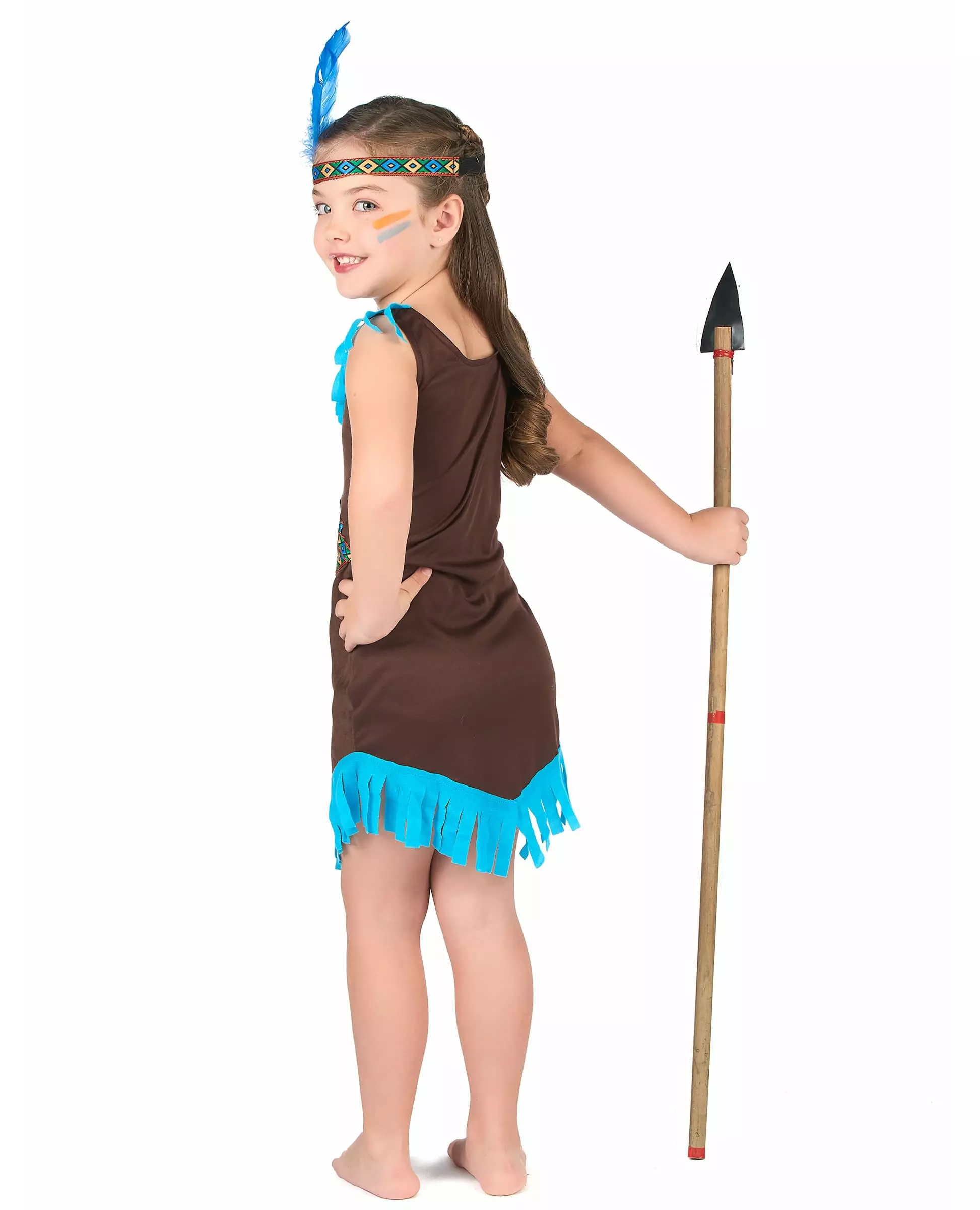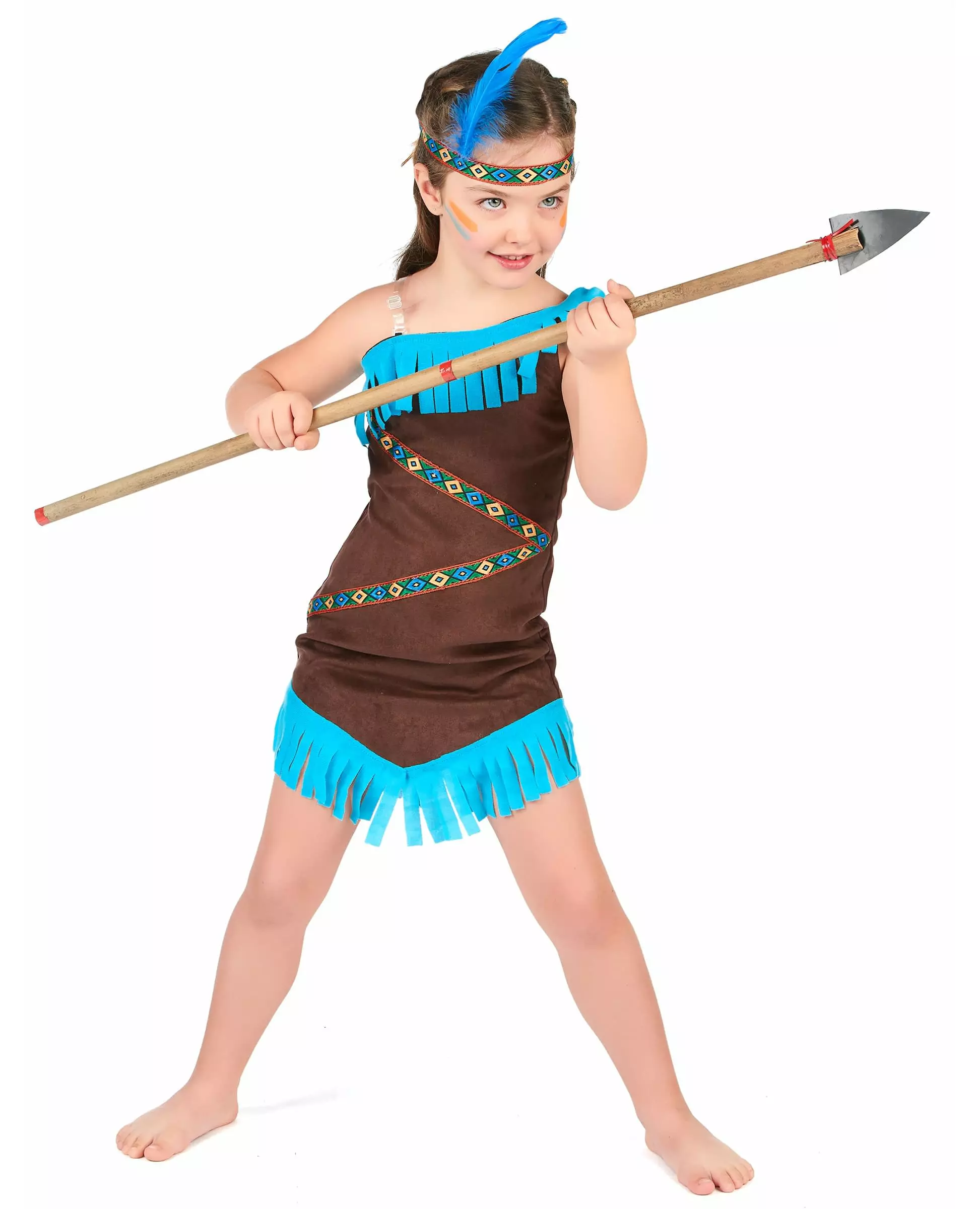Lille apache! Dette indianerkostymet for jenter består av en kjole og et pannebånd. Den brune kjolen har en asymmetrisk krage. Den er dekorert med blå frynser på toppen og bunnen. Etniske kanter pryder forsiden av kjolen. Pannebåndet er toppet med en blå fjær. Dette lille indianerkostymet vil være perfekt for karneval eller en fest med western-tema. Inkludert tilbehør: Pannebånd til kjolen Materiale: Polyester Stell: Håndvask Målinformasjon: western, indiansk