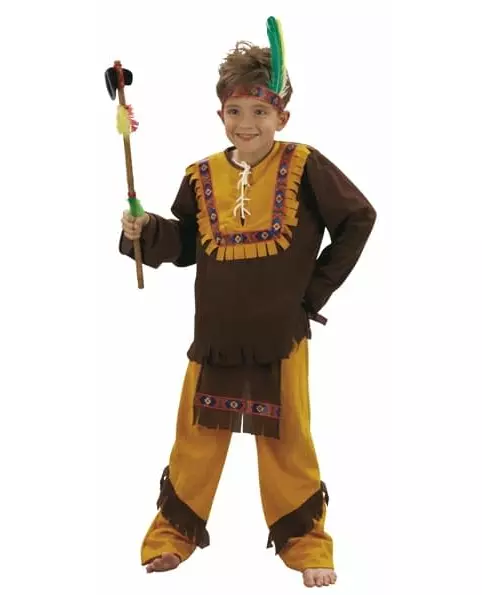 Med frynser for ekstra autentisitet! Dette guttekostymet for indianske indianere inkluderer en topp, bukser og et pannebånd (resten er ikke inkludert). Toppen har lange ermer og er brun og gul. Det er frynser nederst og på brystet. Buksene har en elastisk linning og er for det meste gule. Et brunt frynsete forkle er sydd foran. Til slutt er pannebåndet elastisk og skinnende med indianske mønstre trykt på det. Hele antrekket er laget av mykt stoff. For et western-tema show på slutten av året, eller til karneval, vil dette kostymet være perfekt. Inkludert tilbehør: Topp Bukser Pannebånd (uten fjær) Materiale: 100 % polyester Vedlikehold: Renseri