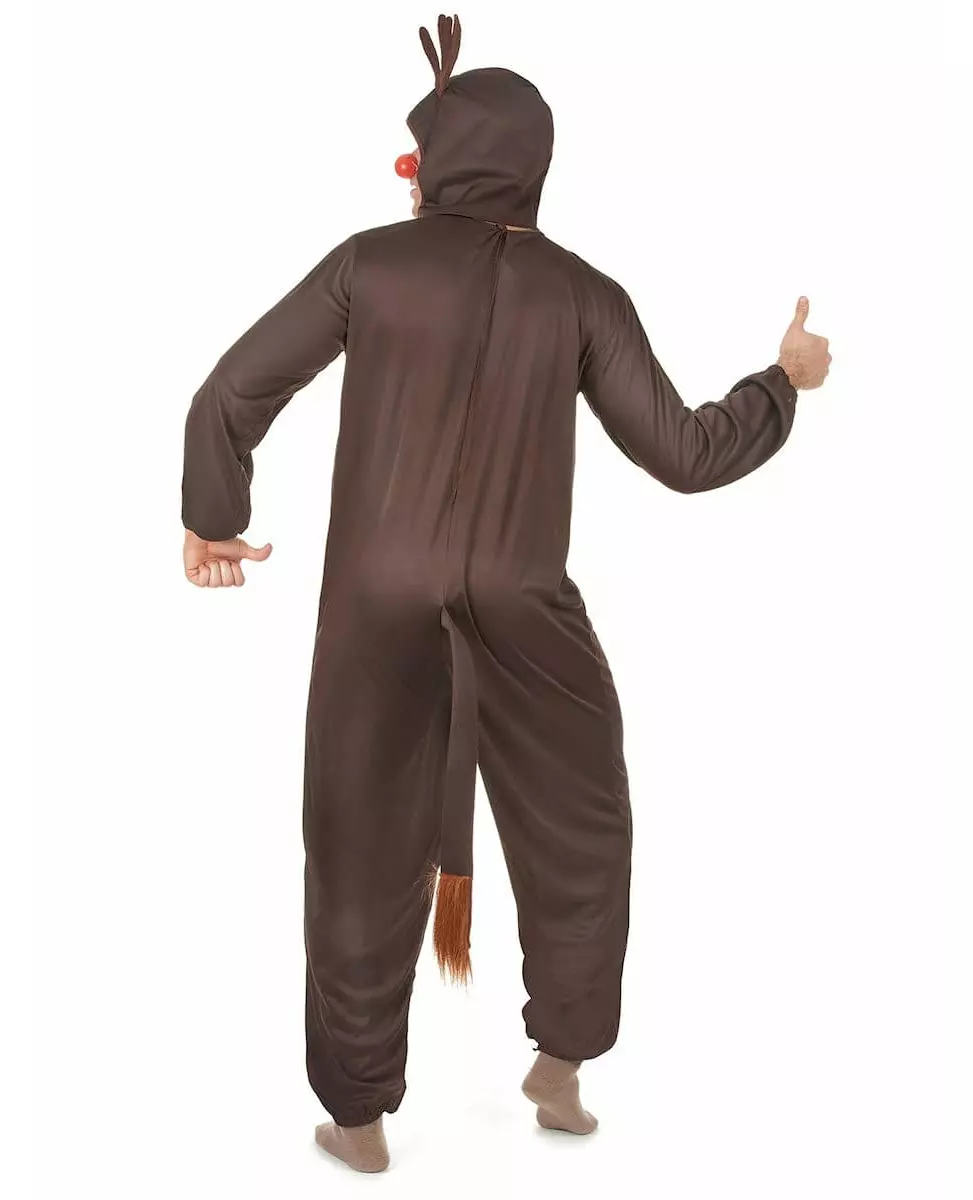 Komplett! Dette reinsdyrkostymet for voksne inkluderer en jumpsuit og en hette. Hele jumpsuiten har en lett skinnende brun farge. I midten representerer en beige oval reinsdyrmagen. På ryggen er en hale dekorert med fuskepels sydd til jumpsuiten. En hette som matcher jumpsuiten fullfører antrekket. Den har gevir øverst og borrelåslukking i halsen som sikrer en god passform. Dette reinsdyrkostymet er perfekt for å kle seg ut på julaften eller til andre fester med dyretema. Inkludert tilbehør: Jumpsuit Hette Materiale: 100 % polyester Vedlikehold: Håndvask