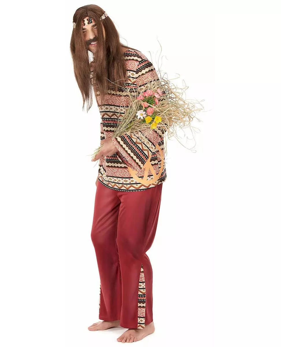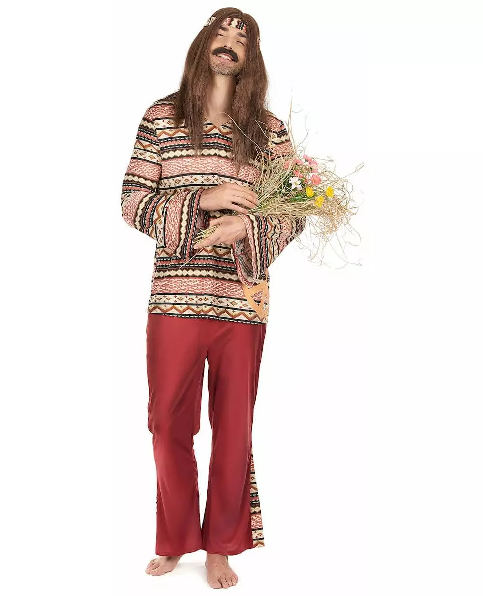 Spre hippiekjærligheten! Dette hippiekostymet for menn inkluderer en tunika, bukser og et pannebånd (bart, parykk og blomster er ikke inkludert). Den langermede tunikaen er fargerik i rosa, svart, beige og brunt, noe som skaper et veldig 60-tallsinspirert mønster! Freds- og kjærlighetssymbolet er flokket i oransje på venstre side av tunikaen, mens ermene er utsvingte og gjenspeiler bunnen av buksene, som har samme effekt. Buksene er burgunderrøde, med en detalj på venstre ben som gjenspeiler tunikas mønstre for et ekte hippie-utseende. Fullfør antrekket ditt med pannebåndet som du kan knyte rundt hodet for en garantert retroeffekt. Reis tilbake i tid og spre kjærlighet og fred rundt deg i hippie-stil! Inkludert tilbehør: Bukser Tunika Pannebånd Materiale: 100 % polyester Stell: Håndvask Målinformasjon: For en størrelse XL måler toppen 77 cm lang og 52 cm bred. Buksene måler 107 cm lange.