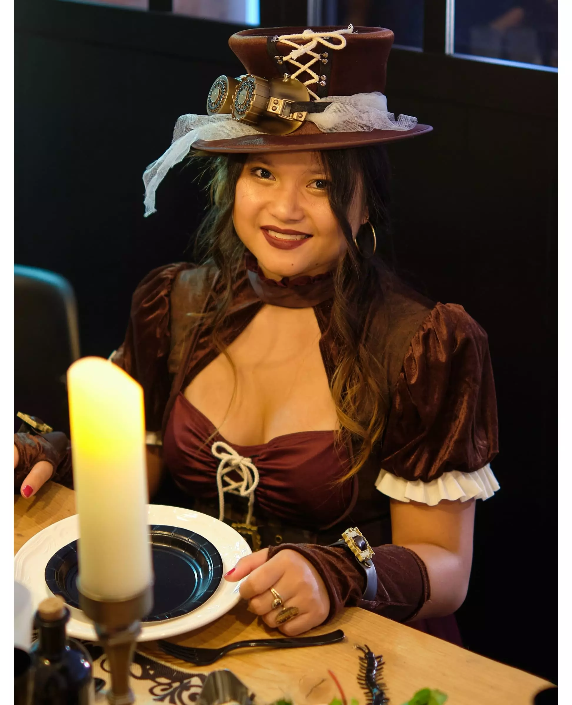 Retrofuturistisk reise til 1800-tallet Dette burgunderfargede steampunk-kostymet for kvinner består av en kjole, et par hansker, en hatt og briller. Kjolen har en kortermet brun skinnvest og et stripete imitert korsett som er både elegant og retro. Det asymmetriske antrekket, dekorert med en pen fald, avslører beina dine for en avgjort sexy effekt. Den litt utsvingte nedre delen er utsmykket med to gylne spenner, mens flosshatten med briller ser rett ut fra industritiden. Votter fullfører ensemblet. Dette steampunk-kostymet for kvinner er perfekt for å ta et skritt tilbake til hjertet av den viktorianske tiden. Det er ideelt for kostymefester med vennene dine eller til et show. Inkludert tilbehør: kjole, hansker, hatt, briller Materiale: 100 % polyester Vedlikehold: Håndvask