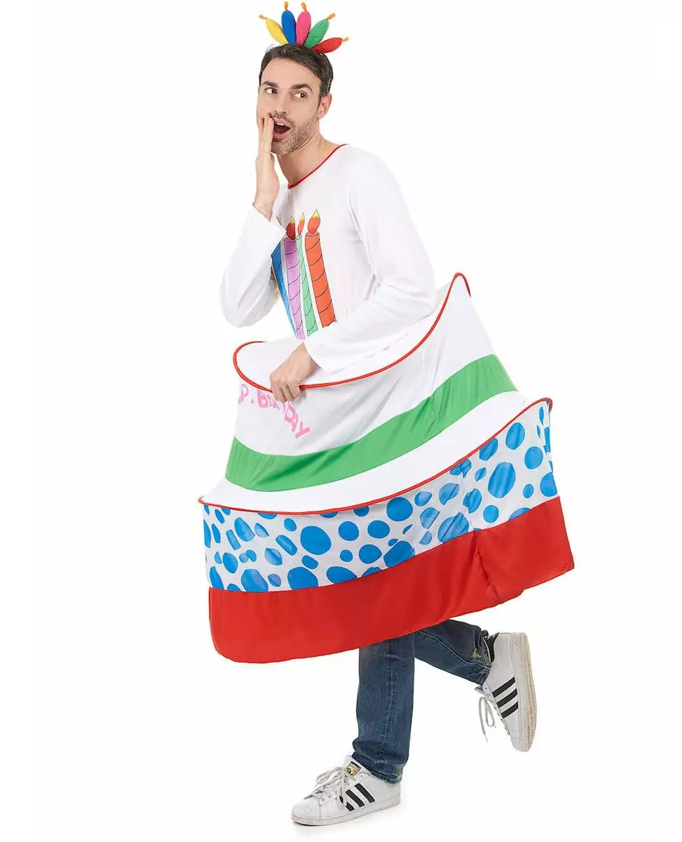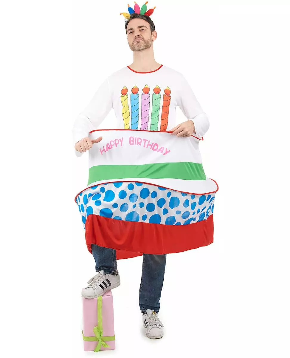 Gratulerer med dagen! Dette bursdagskakekostymet for menn består av en jumpsuit og et pannebånd (strømpebukser ikke inkludert). Den svært elastiske jumpsuiten har to ringer og trykk foran. Den er veldig enkel å ta på. Et pannebånd med lys i forskjellige farger er også inkludert. Dette humoristiske kostymet vil være ideelt for å få vennene dine til å le på en bursdag eller en annen temafest. Inkludert tilbehør: Jumpsuit Hodeplagg Materiale: 100 % polyester Stell: Håndvask