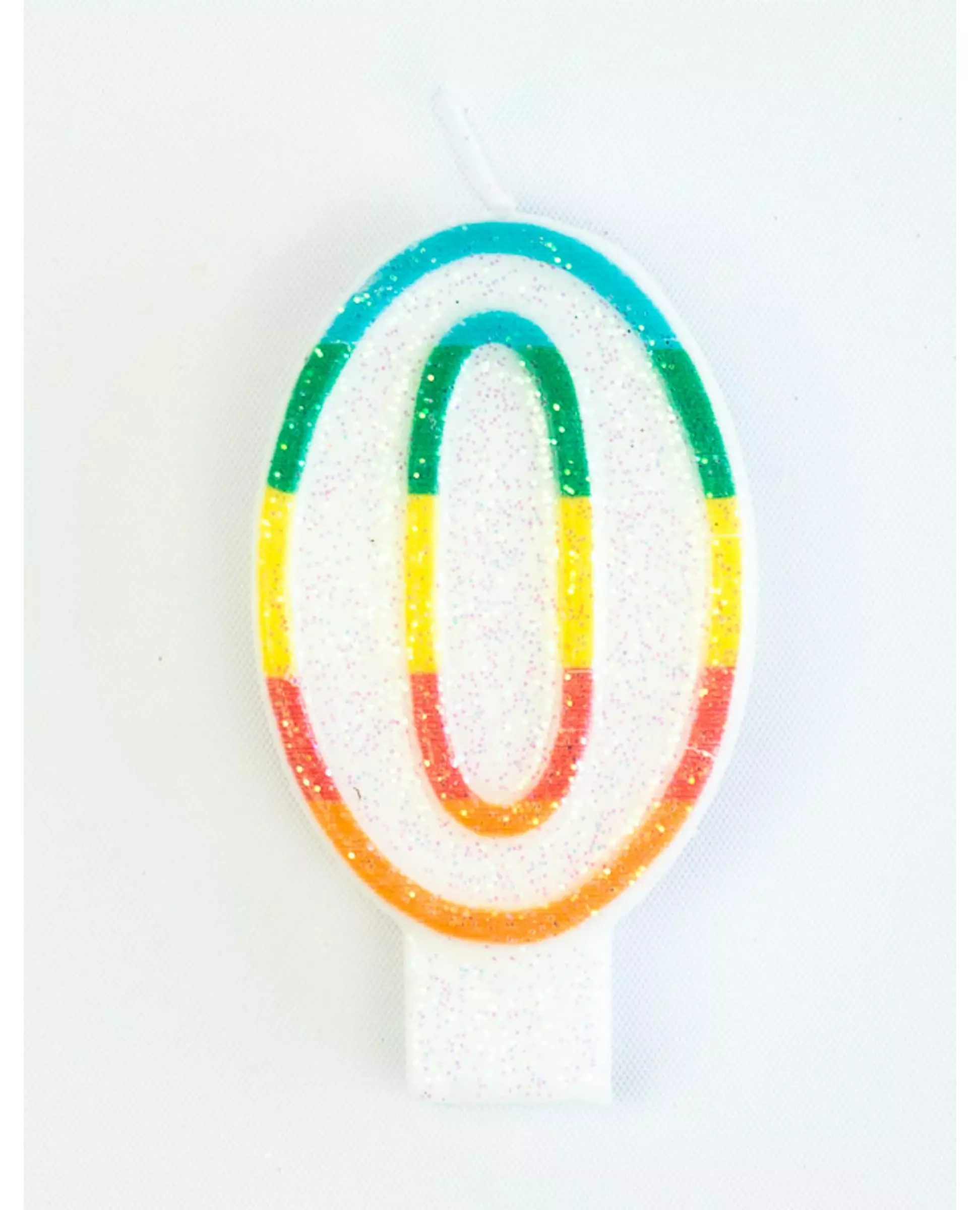Et nytt tiår! Dette bursdagslyset med nummer 0 måler omtrent 7,5 cm. Det er laget av voks, hvitt i fargen, kantet med et flerfarget mønster og drysset med glitter for et festlig utseende! Dette lyset har en hake i bunnen, slik at det enkelt kan plasseres på kaken din for å lyse opp bursdagsfesten din! Du kan kombinere dette lyset med et annet for å feire et nytt tiår på en bursdags- eller bryllupsdagsfest! Inkludert tilbehør: 1 lys Materiale: Voks