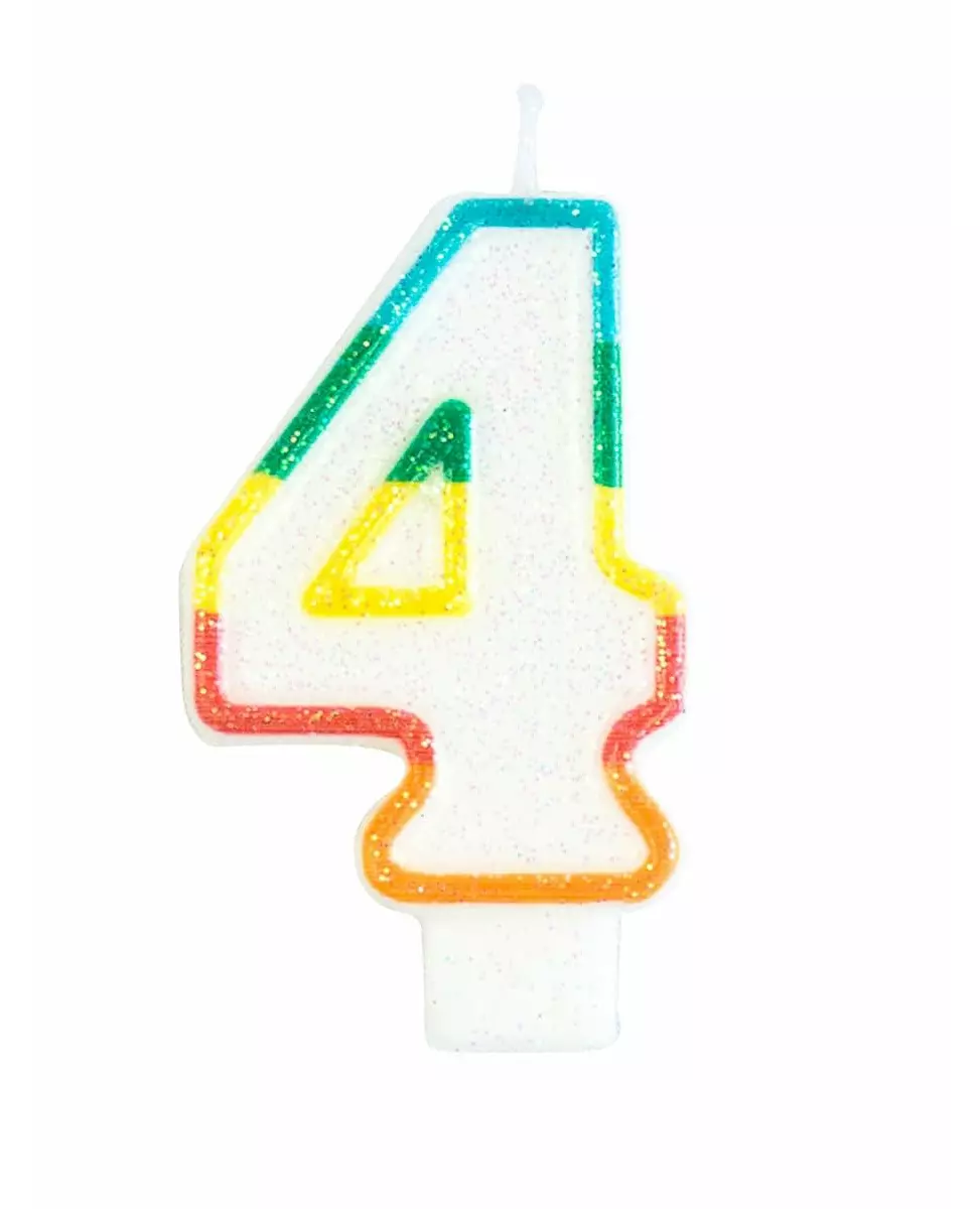 ganger mer lykke! Dette bursdagslyset representerer tallet 4. Det er laget av hvit voks og har en farget og glitrende omriss. Det måler omtrent 7,5 cm, og du kan kombinere det med andre lys. Et viktig festtilbehør for å feire bursdagen din ordentlig. Inkludert tilbehør: 1 lys Materiale: Voks