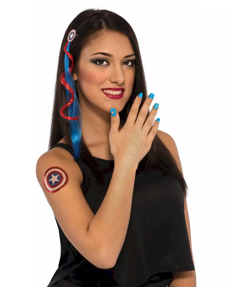 Gå inn i Captain Americas sko Dette Captain America™-tilbehørssettet for kvinner består av en hårforlengelse, falske negleklistremerker og glittergel. Hårforlengelsen består av en rett blå hårstrå og en bølget rød hårstrå. De to hårstråene er festet til et klistremerke som representerer Captain Americas skjold. De falske negleklistremerkene er blå med forskjellige mønstre: hvite stjerner, superheltens skjold eller til og med røde og hvite striper. Til slutt fullfører en glittergel settet. Dette settet med tilbehør vil være perfekt for å fullføre Captain America-kostymet ditt. til karneval eller en superhelttemafest. Inkludert tilbehør: Wick Falske negleklistremerker Gel