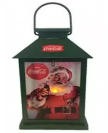 Din julelykt! Denne julelykten er offisielt lisensiert av Coca-Cola. Den lyser opp av LED-lys (3 LR44-batterier er ikke inkludert). Den måler omtrent 12 cm lang, 12 cm bred og 26 cm høy. Den er mørkegrønn med et lite håndtak for enkel bæring og et vintage-utseende. Den er dekorert med et trykk av julenissen som holder en flaske Coca-Cola. To røde logoer fra brusmerket er på lykten, en på trykket og en annen på toppen. Denne lysende lykten vil være perfekt for å dekorere interiøret ditt i retrostil og skape en varm, vintage-atmosfære til jul! Inkludert tilbehør: 1 lykt, Materiale: Plast,