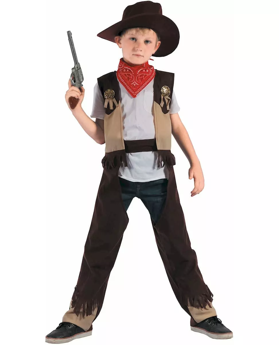 Bli sheriff for en dag. Dette cowboykostymet for gutter består av en vest, overtrekksbukser, en hatt og en bandana (pistol, skjorte, jeans og sko er ikke inkludert). Vesten er brun og beige, med to gullfargede plastdeler på sidene. De matchende overtrekksbuksene lukkes med borrelås i livet. Chowboyhatten er brun, i et filt-effekt stoff. Bandanaen er rød med svarte og hvite mønstre. Den knytes rundt halsen. Dette cowboykostymet vil være perfekt for en fest med western- eller karnevalstema. Inkludert tilbehør: Vest Overtrekksbukser Hatt Bandana Materiale: 100 % polyester Stell: Håndvask Målinformasjon: For størrelse 3/4 år, vest 30 cm lang og overtrekksbukser ca. 58 cm lange