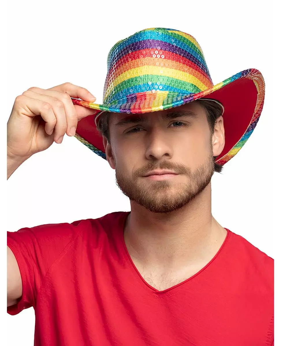 En fargerik cowboy! Denne cowboyhatten med regnbue-paljetter for voksne viser en dristig og festlig stil takket være det flerfargede paljettbelegget. Med sine fargerike bånd og skinnende effekt er den perfekt for å skille seg ut på et kostymearrangement, et karneval, en temafest eller en pridemarsj. Et morsomt og fargerikt tilbehør som gir et særegent preg til ethvert western- eller fargerikt antrekk. Inkludert tilbehør: 1 hatt