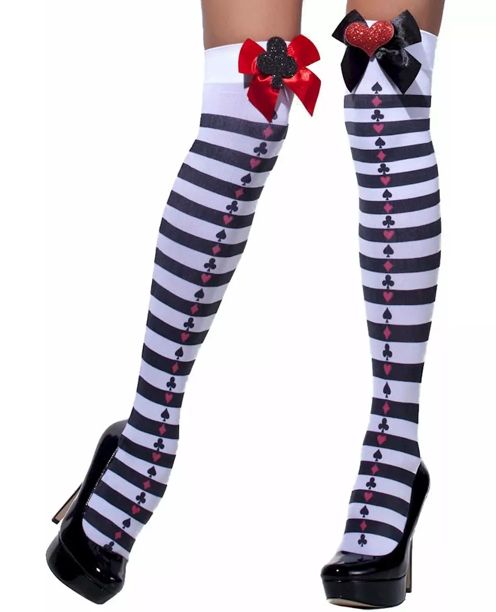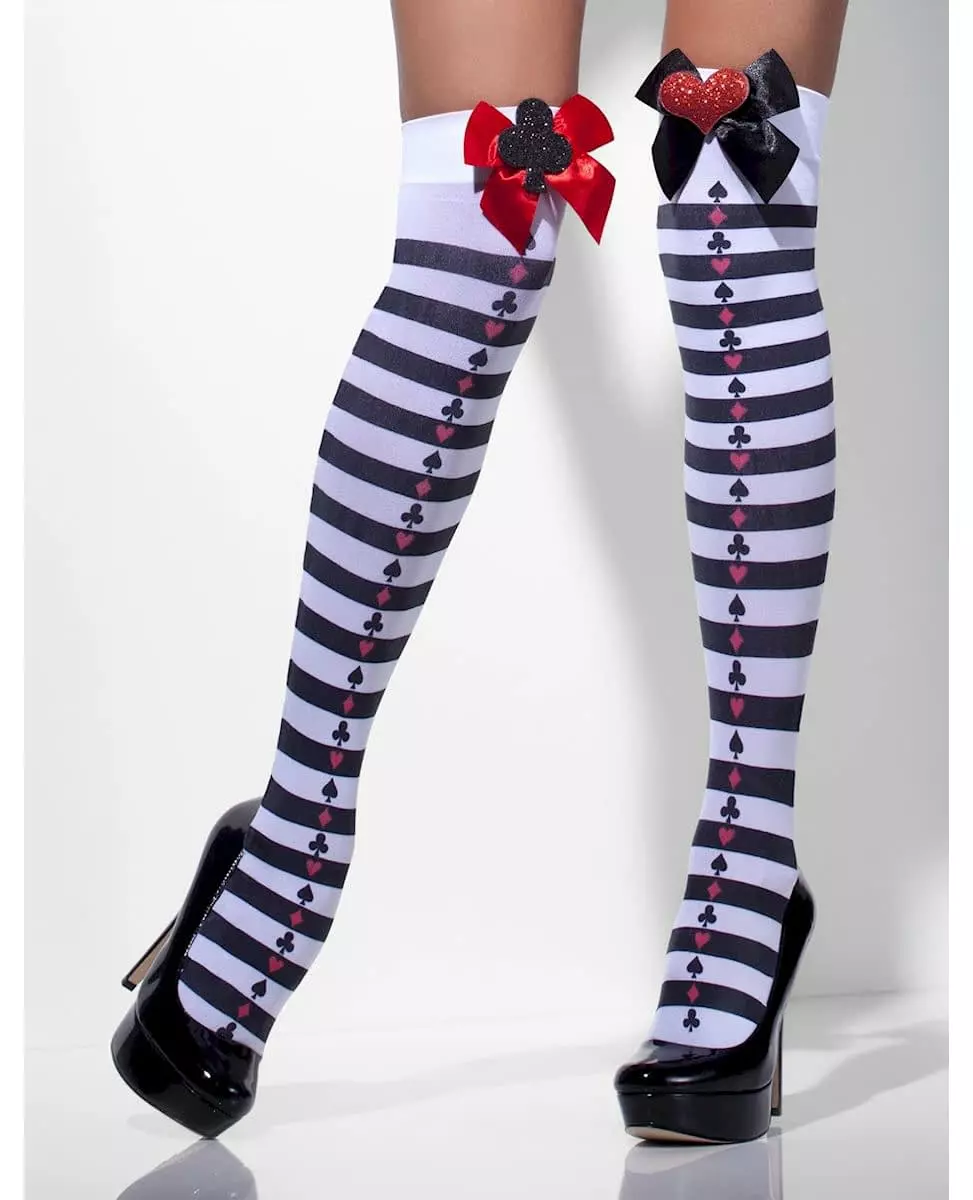 Originale strømper! Dette paret med ugjennomsiktige kortdronningstrømper er for kvinner. De går rett over kneet. De har svarte og hvite striper, og spar, hjerter, kløver og ruter er trykt på forsiden og baksiden av strømpene. To sløyfer foran med en kløver og et hjerte på en rød satengsløyfe vil også være tilstede. Disse strømpene vil være perfekte for å fullføre hjerterdronning-, kortdronning-kostymet ditt til karnevalet! Inkludert tilbehør: -strømper Materiale: 100 % nylon