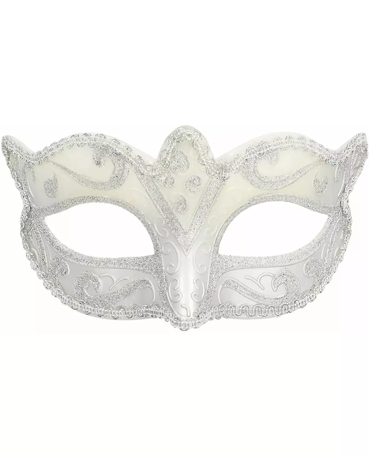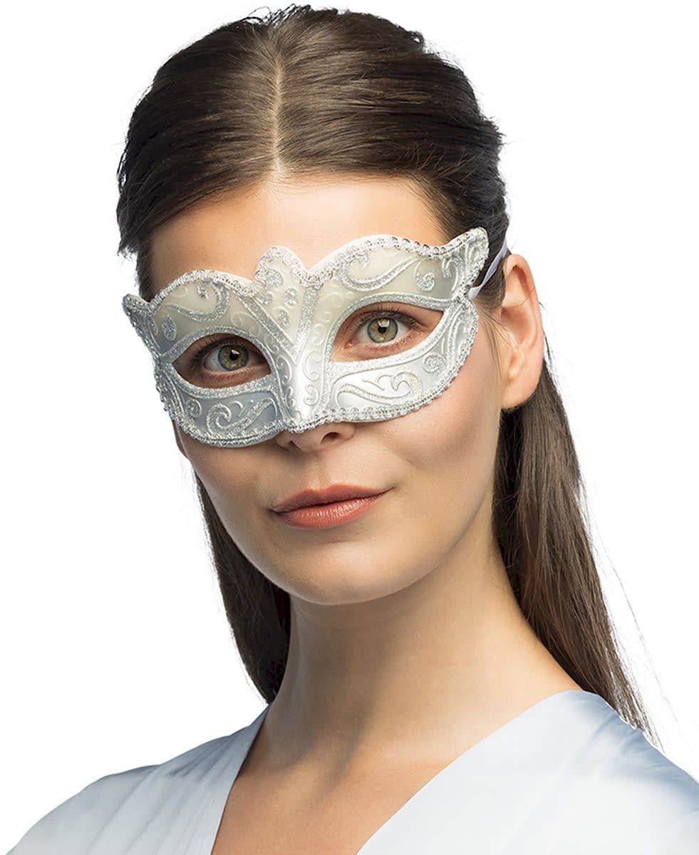 Skinn klart om natten! Denne venetianske masken for voksne er sølvfarget. Laget av plast og dekorert med glitrende arabesker. Masken kan enkelt knytes til hodet med hvite bånd. Masken vil være perfekt for maskerte og sexy fester. Inkludert tilbehør: Maske, Materiale: Plast,