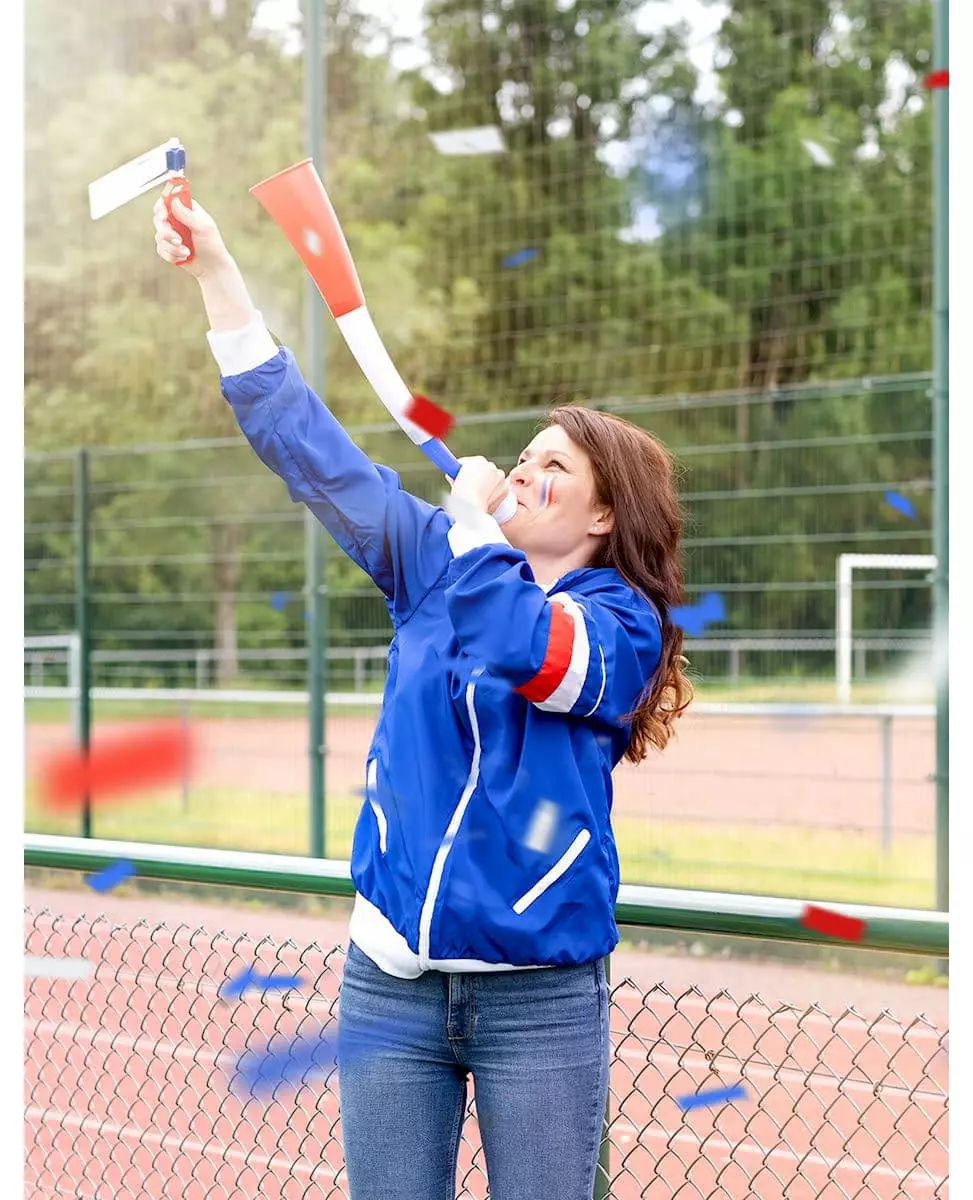 Allez les bleus! Denne Frankrike-supporterjakken er for kvinner. Den har et bombermotiv, er blå og hvit med satengfinish. Den er dekorert med det franske flagget på venstre arm og har inskripsjonen «France» i hvitt på brystet. Den har en hvit glidelås. Oppmuntre det franske laget under en sportskonkurranse med denne fantastiske Frankrike-supporterjakken! Inkludert tilbehør: Jakke Materiale: 100 % polyester Vedlikehold: Håndvask