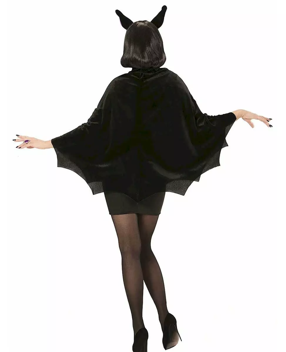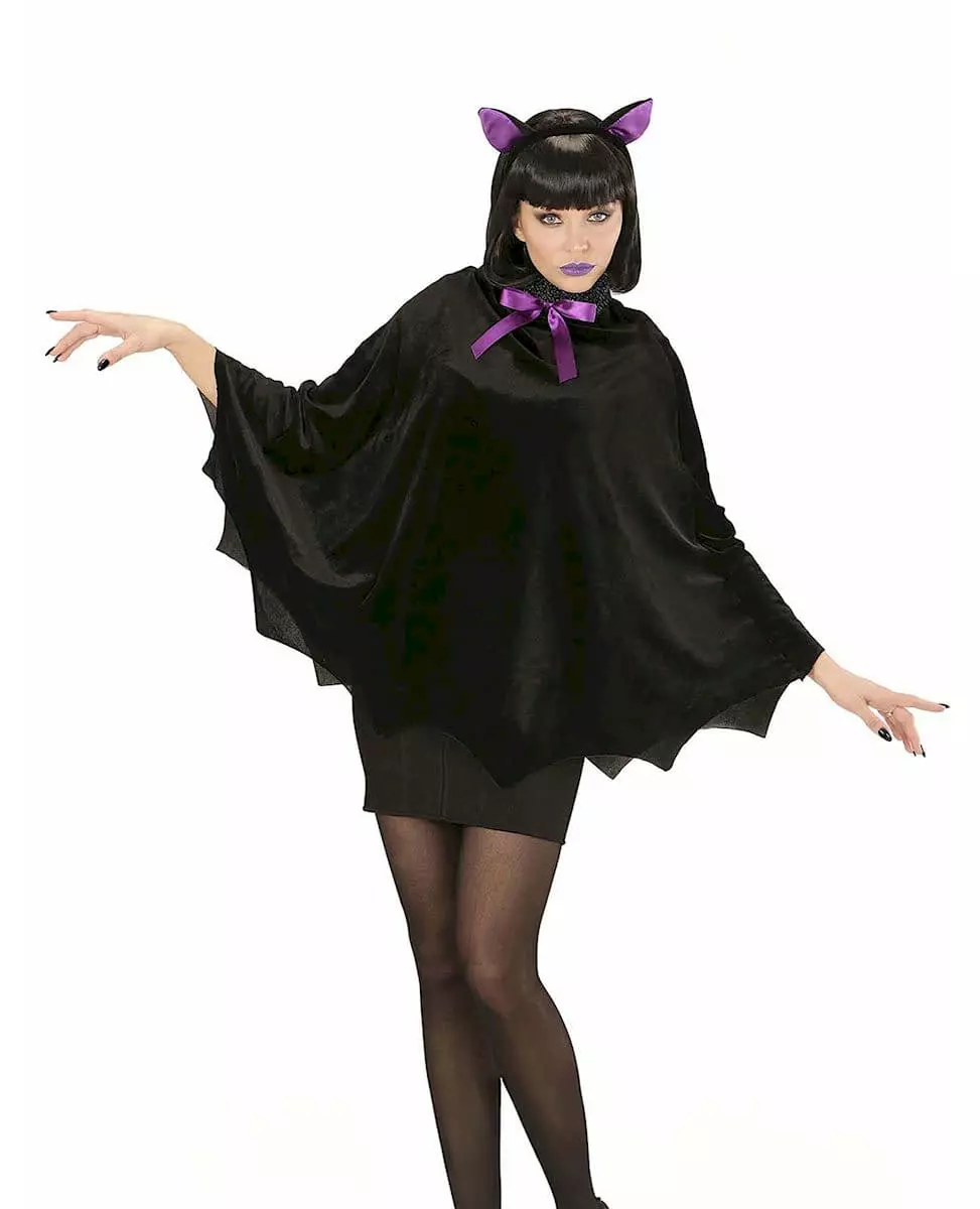 Forvandle deg til en flaggermus Denne hettegenser-ponchoen med flaggermus er for kvinner. Den er svart med en lilla sløyfe i kragen og lilla ører på hodet. Nederdelen av ponchoen imiterer formen på flaggermusvinger. Den vil være perfekt til et flaggermuskostyme til Halloween. Inkludert tilbehør: Poncho med ører Materiale: 100 % polyester Vedlikehold: Håndvask
