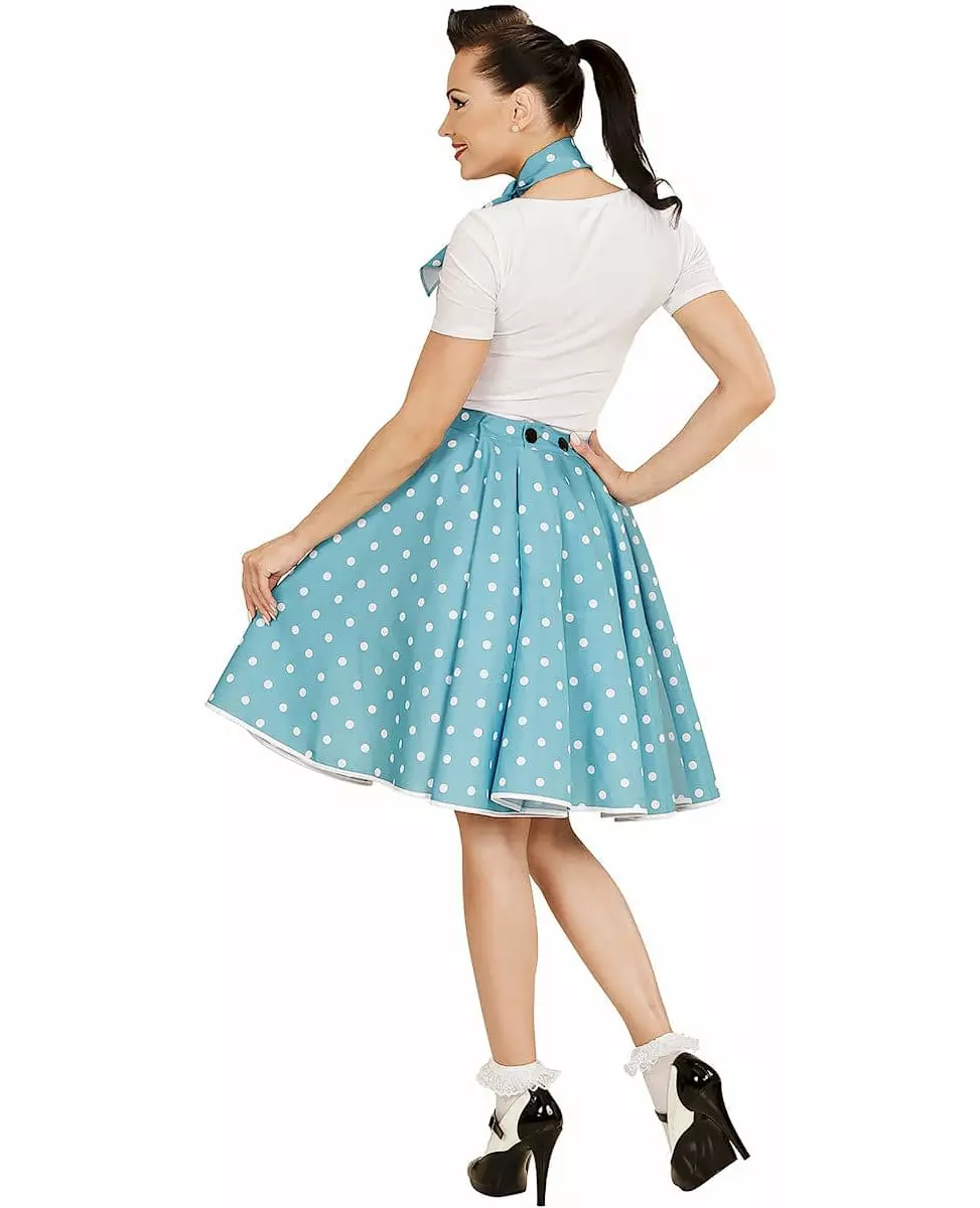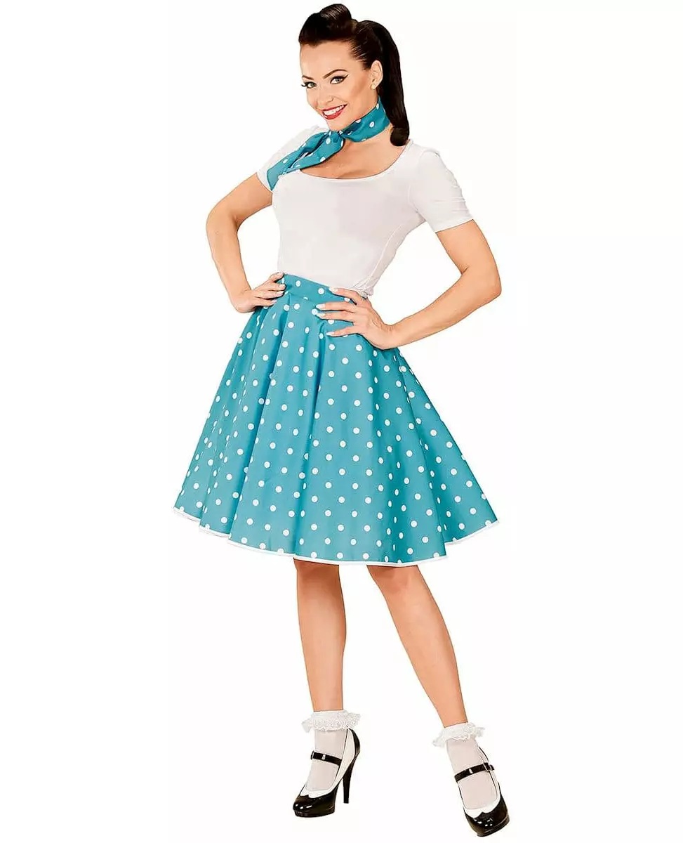Tilbake til 50-tallet! Dette 50-tallskostymet for kvinner består av et skjørt og et skjerf (t-skjorte, sokker og sko er ikke inkludert). Settet er turkis med hvite prikker. Skaterskjørtet, tilgjengelig i én størrelse, lukkes bak med en knapp. De tre tilgjengelige knappene lar deg justere skjørtet til kroppsfasongen din. Det måler omtrent 60 cm i høyden og går over knærne. Skjerfet er matchende og knytes enkelt rundt halsen. Dette settet vil være ideelt for å dykke tilbake til 50-tallet for en utkledningsfest eller til karneval! © Copyright Widmann SRL. Inkludert tilbehør: Skjørt Skjerf Materiale: 100 % polyester Pleie: Håndvask