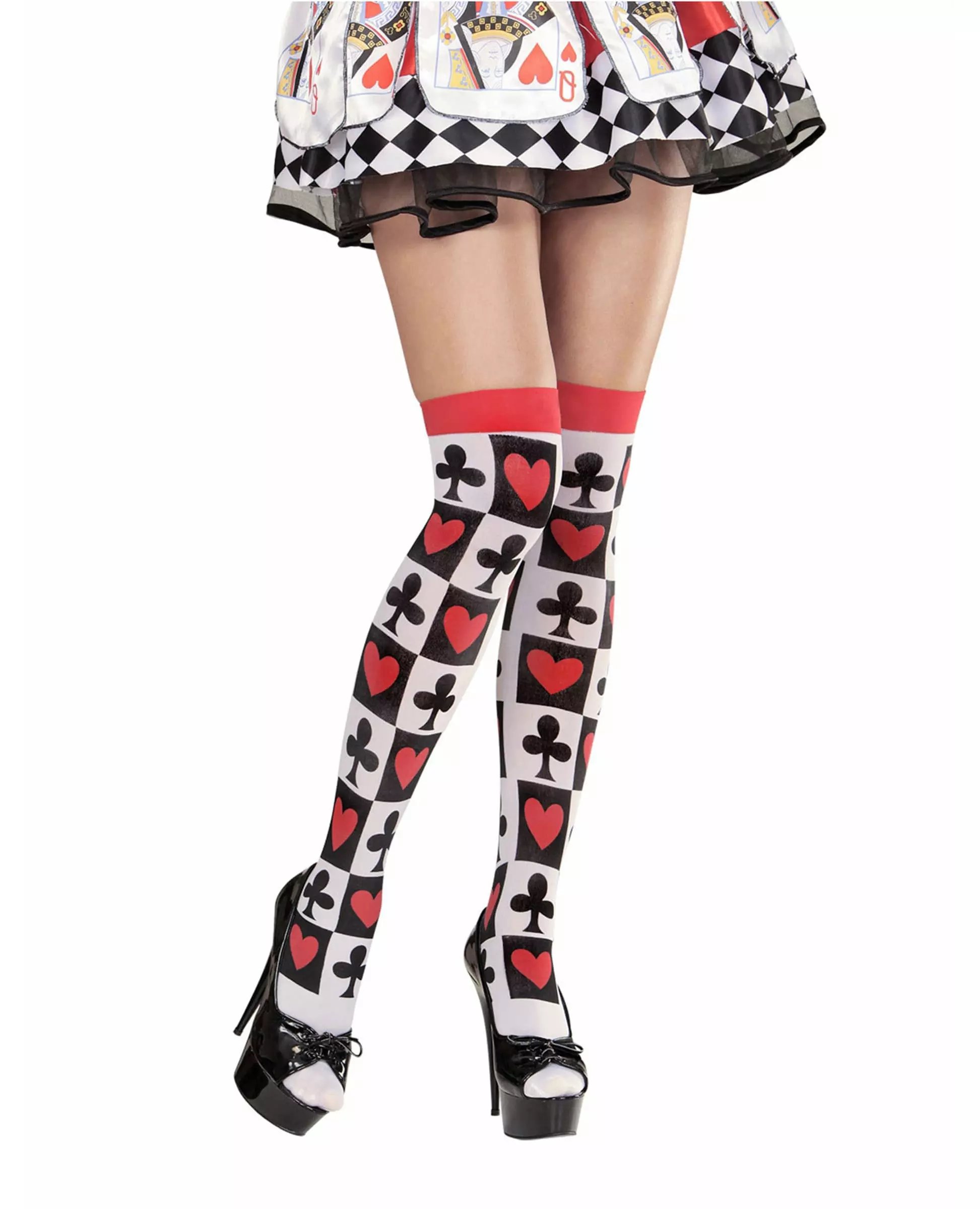Damestrømper med dronning av kort Føl deg som hjerterdronningen Disse strømpebuksene for voksne er i 50 denier. De er hvite og svarte, med mønstre av røde hjerter og svarte kløvere.