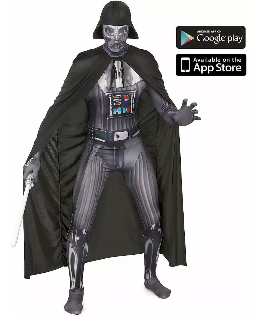 Dra til den mørke siden av Kraften! Dette Darth Vader Morphsuits™-kostymet er offisielt lisensiert. Det består av en jumpsuit, en hatt og en kappe (sabel ikke inkludert). Second-skin-jumpsuiten har Darth Vaders rustning på forsiden. Den er ensfarget grå på baksiden. Den er veldig elastisk og festes på baksiden med en lang glidelås. Du kan åpne glidelåsen på hodedelen hvis du vil vise ansiktet ditt. Den lange kappen er svart. Den knytes rundt halsen. Den svarte, tynne skumhatten vil fullføre kostymet ditt. For mer moro kan du laste ned den gratis Morphsuits-appen på smarttelefonen din. Når du er i appen, går du til "Zappar"-delen. Blink lynlogoen på second-skin-hånden. Appen vil gjenkjenne Darth Vader-kostymet. Poser foran kameraet ditt, og marker logoen. Den vil deretter avsløre et lyssabel i hånden din. Ta fantastiske bilder verdige mesteren over den mørke kraften fra Star Wars! Dette Morphsuits™-kostymet Darth Vader-kostymet vil være perfekt for å legemliggjøre den berømte Sith-herren til en Star Wars-fest eller karneval. Inkludert tilbehør: Jumpsuit, hodeplagg, kappe. Materiale: 91 % polyester, 9 % elastan. Vedlikehold: Håndvask.