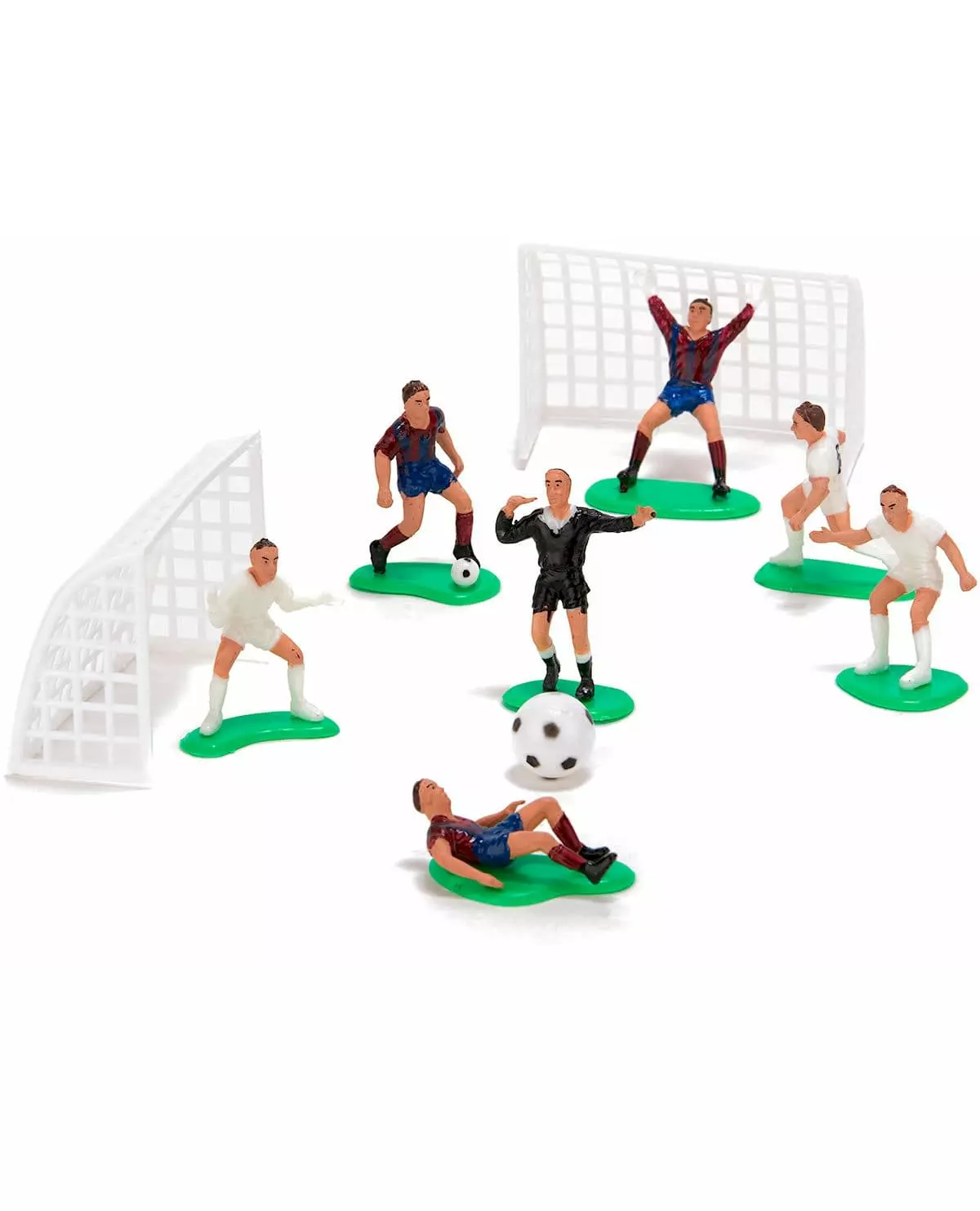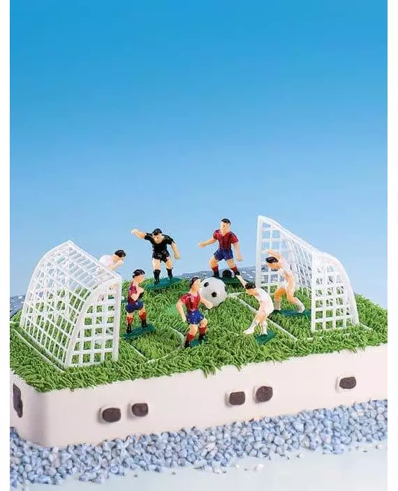 Ideelt for en original bursdagskake! Dette settet består av 10 plastkakedekorasjoner med temaet fotball. Det inkluderer 6 fotballspillere med en 6 cm høy dommer, en ball og to 6,5 x 10 cm fotballmål. Dette settet vil være perfekt for å dekorere bordet eller bursdagskaken din på en original måte. Inkludert tilbehør: 7 figurer 1 ball 2 fotballmål Materiale: Plast