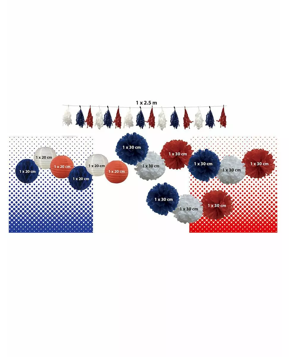 En dekorasjon i Frankrikes farger! Dette dekorasjonssettet for Frankrike-supportere består av en girlander, 9 pomponger, 4 kinesiske lykter og 2 bikakeformede papirballer. Girlanderen måler omtrent 2,5 meter lang og er laget av duskpomponger i fargene til det franske flagget: blå, hvit, rød. De 9 pompongene måler omtrent 30 cm i diameter og har forskjellige farger: 3 hvite pomponger, 3 blå pomponger, 3 røde pomponger. De kinesiske lyktene måler omtrent 20 cm i diameter og inneholder 2 hvite lykter og 2 røde lykter. Til slutt består pakken av 2 blå bikakeformede papirballer. De måler omtrent 20 cm i diameter. Dekorer stuen din i Frankrikes farger med dette dekorasjonssettet for Frankrike-supportere til en sportskonkurranse eller under nasjonaldagen!. Inkludert tilbehør: 1 girlander 9 pomponger 4 kinesiske lykter 2 bikakeformede baller Målinformasjon: nasjonaldag, 14. juli, VM, EM, Frankrike, Fransk, Fransk, fotball, fotball