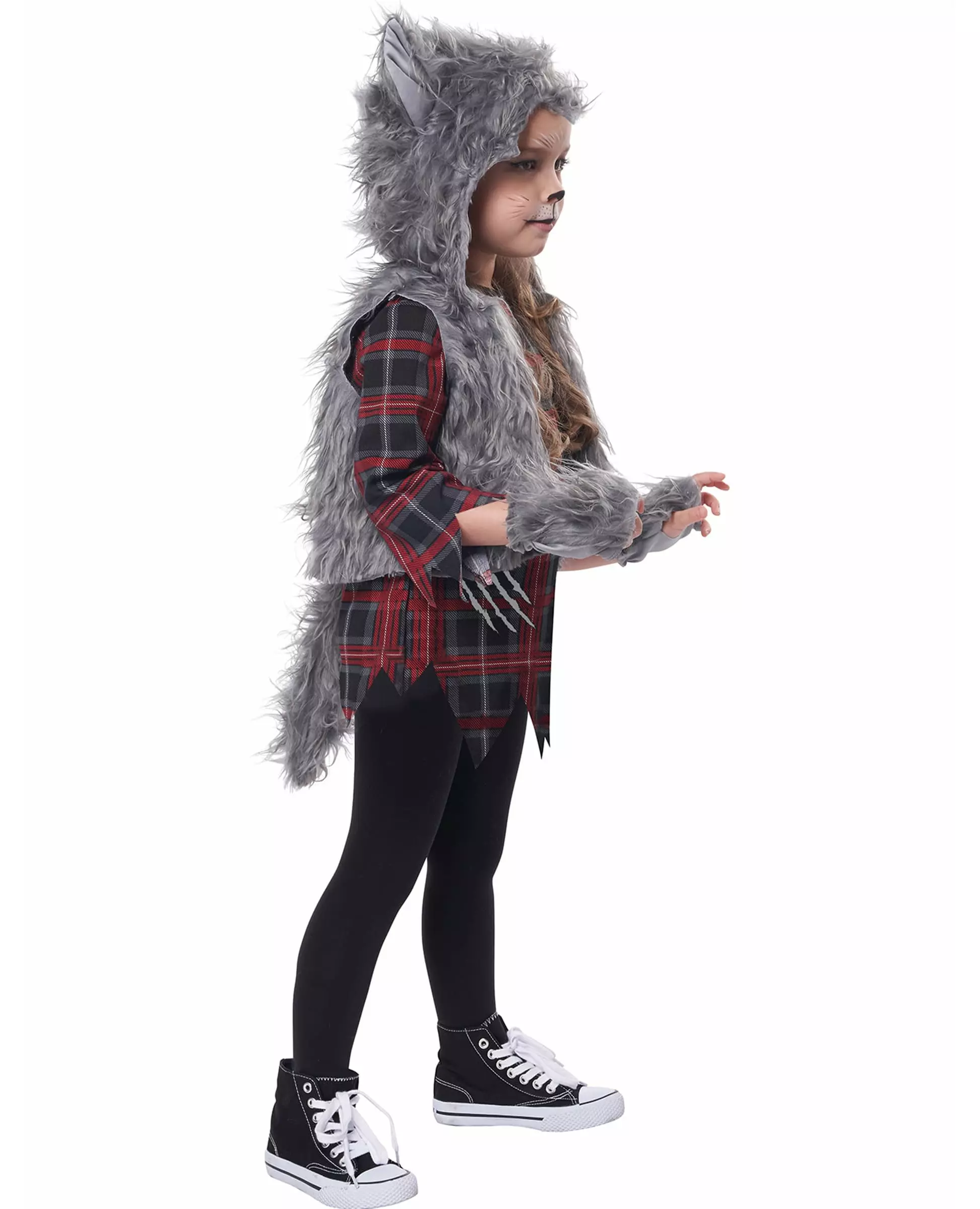 Til Halloween, velg varulvkostymet! Dette varulvkostymet for jenter består av en vest med hette, en tunika, et belte med hale og et par votter (strømpebukser og sko er ikke inkludert). Den kortermede tunikaen er rutete. Ripemerker er også trykt på den. Den er komplettert med et bredt svart belte, hvor en hale med grå pels er festet på ryggen. Den ermeløse vesten har grå pels. En hette er også festet til denne vesten. Den har ulveører på toppen av hodet. Til slutt fullfører grå pelsvotter dette kostymet. Dette kostymet vil være perfekt for knask eller knep på Halloween-kvelden. Materiale: 100 % polyester, (pels): 55 % akryl 45 % polyester, (belte): 100 % PU Inkludert tilbehør: Vest med hette, tunika, belte med hale, 2 votter,