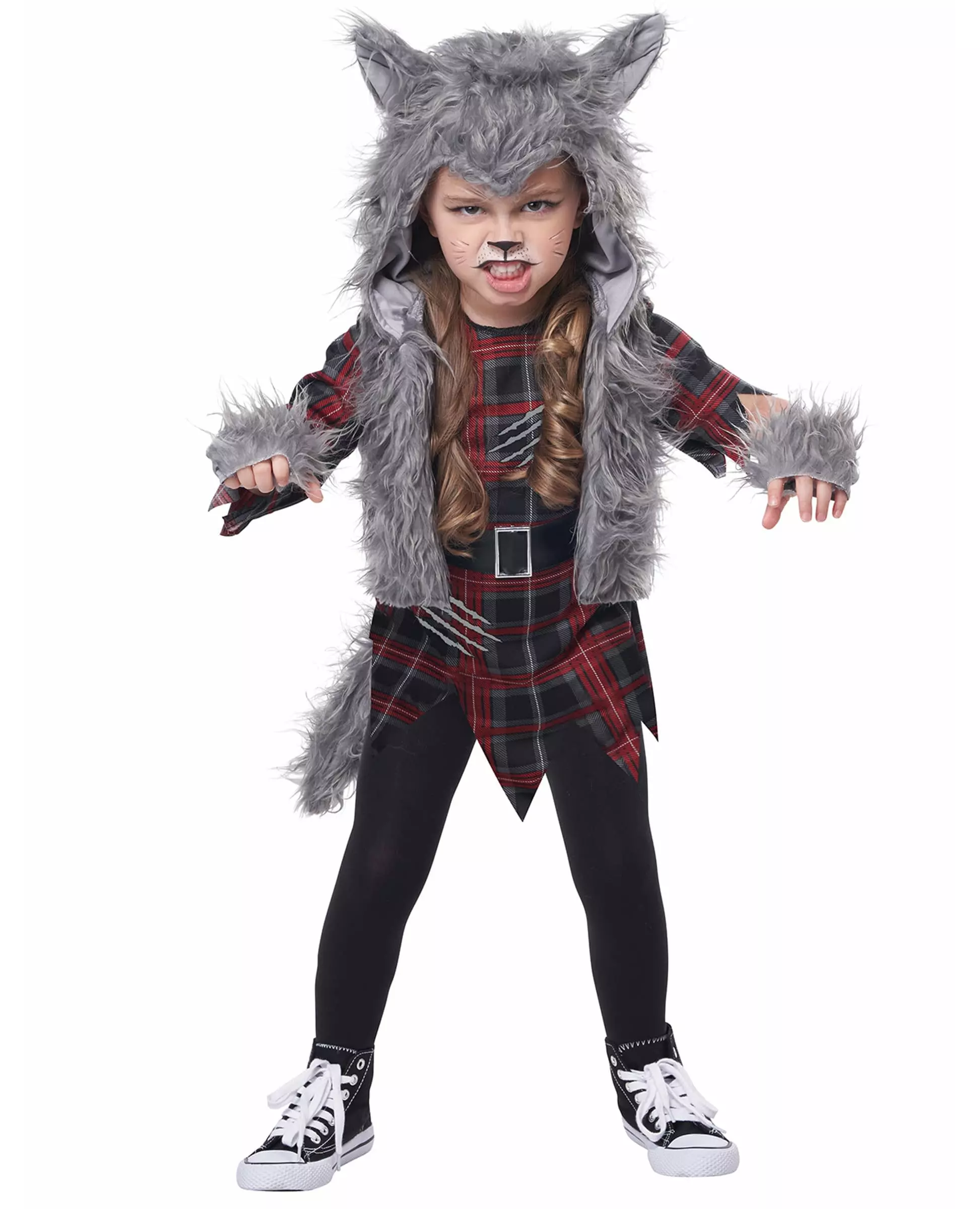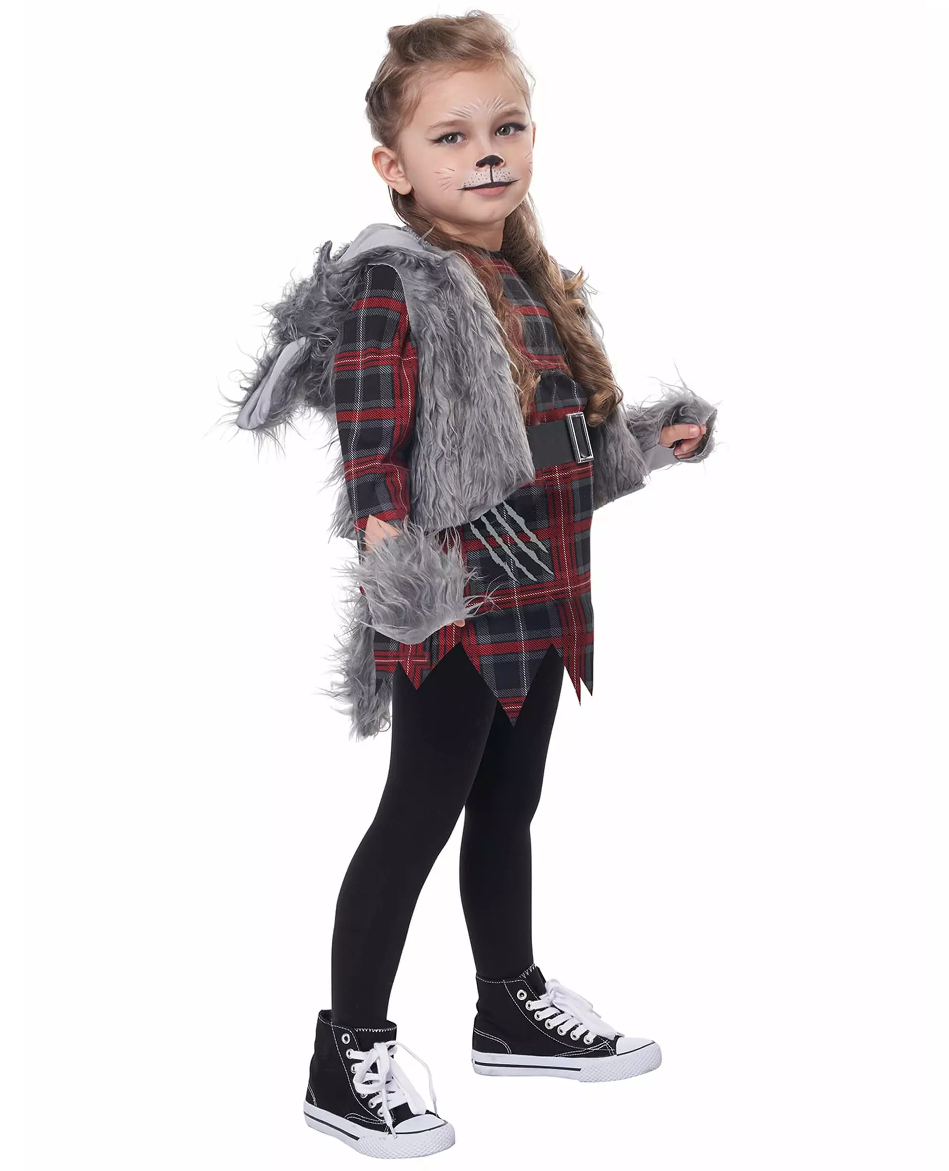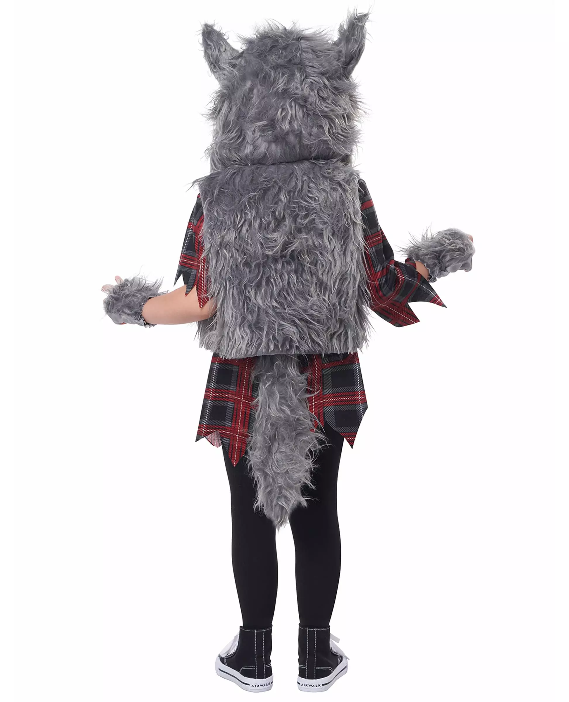 Til Halloween, velg varulvkostymet! Dette varulvkostymet for jenter består av en vest med hette, en tunika, et belte med hale og et par votter (strømpebukser og sko er ikke inkludert). Den kortermede tunikaen er rutete. Ripemerker er også trykt på den. Den er komplettert med et bredt svart belte, hvor en hale med grå pels er festet på ryggen. Den ermeløse vesten har grå pels. En hette er også festet til denne vesten. Den har ulveører på toppen av hodet. Til slutt fullfører grå pelsvotter dette kostymet. Dette kostymet vil være perfekt for knask eller knep på Halloween-kvelden. Materiale: 100 % polyester, (pels): 55 % akryl 45 % polyester, (belte): 100 % PU Inkludert tilbehør: Vest med hette, tunika, belte med hale, 2 votter,