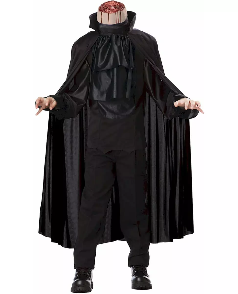 Har du mistet hodet? Dette luksuriøse hodeløse rytterkostymet er for barn. Det inkluderer en topp med kappe, hodeplagg og oppblåsbare skuldre. Den svarte jakken med lange ermer tas på over hodet. En lang kappe og en jabot med imitert blondeeffekt er sydd fast. Den høye kragen vil skjule nesen og munnen. De oppblåsbare skuldrene er laget av plast. Du kan enkelt blåse dem opp med luft. Til slutt vil den blodige latekshjelmen gi effekten av et avhugget hode! Hull i øyehøyde lar deg se over uten problemer. Dette kostymet vil være perfekt for å gå inkognito på en kostymefest eller feire Halloween med venner! Inkludert tilbehør: Topp med kappe Hodeplagg Oppblåsbare skuldre Materiale: 100 % polyester Vedlikehold: Håndvask