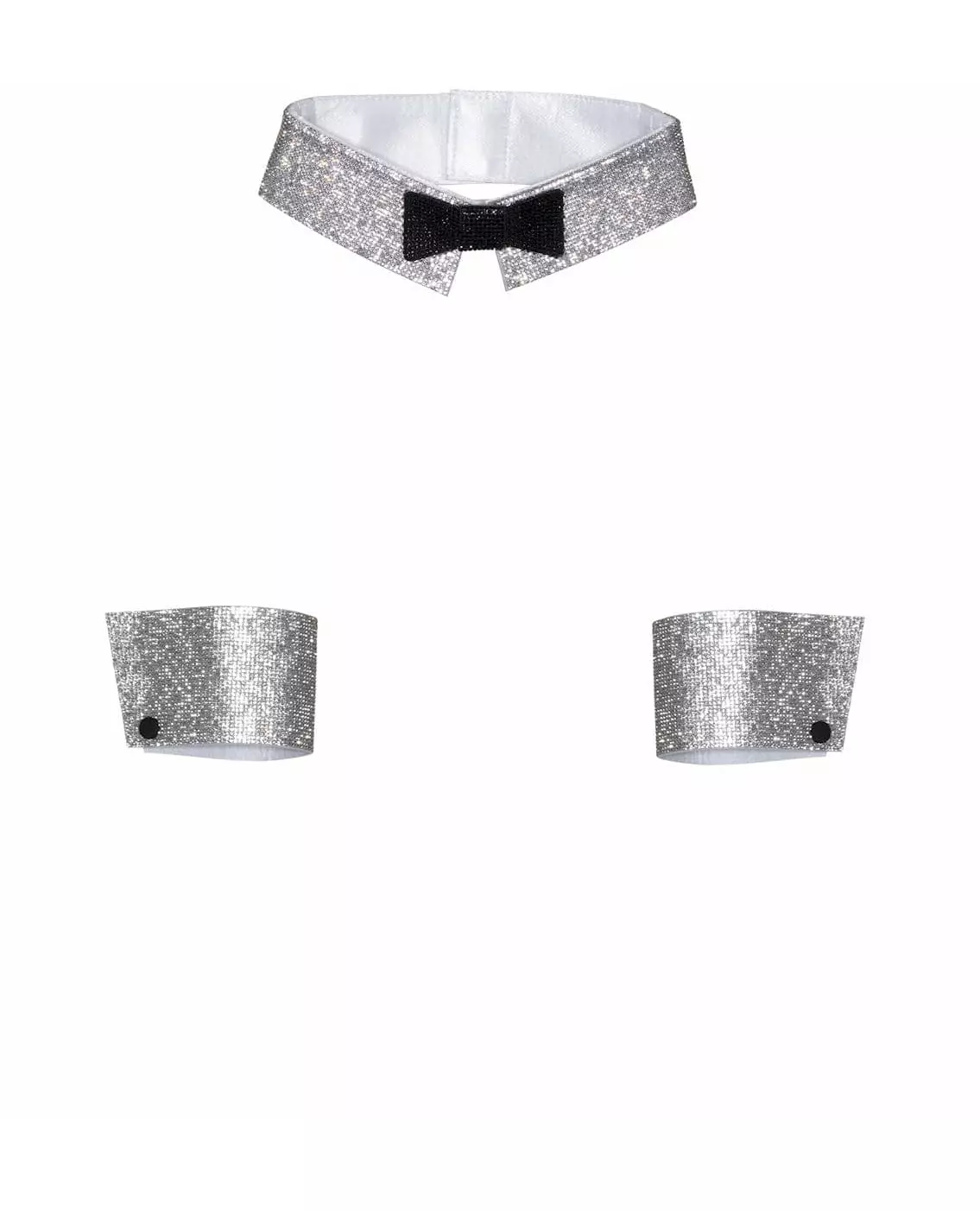 Et sexy sett! Dette damesettet inkluderer en krage og et par mansjetter. Settet er sølvfarget med strass. Kragen er dekorert med en svart sløyfe og mansjettene med falske knapper. Mansjettene lukkes med borrelås. Legg til et sexy preg på kostymet ditt med dette krage- og mansjettsettet til Valentinsdagen eller nyttårsaftenfesten din! Inkludert tilbehør: Krage og mansjetter