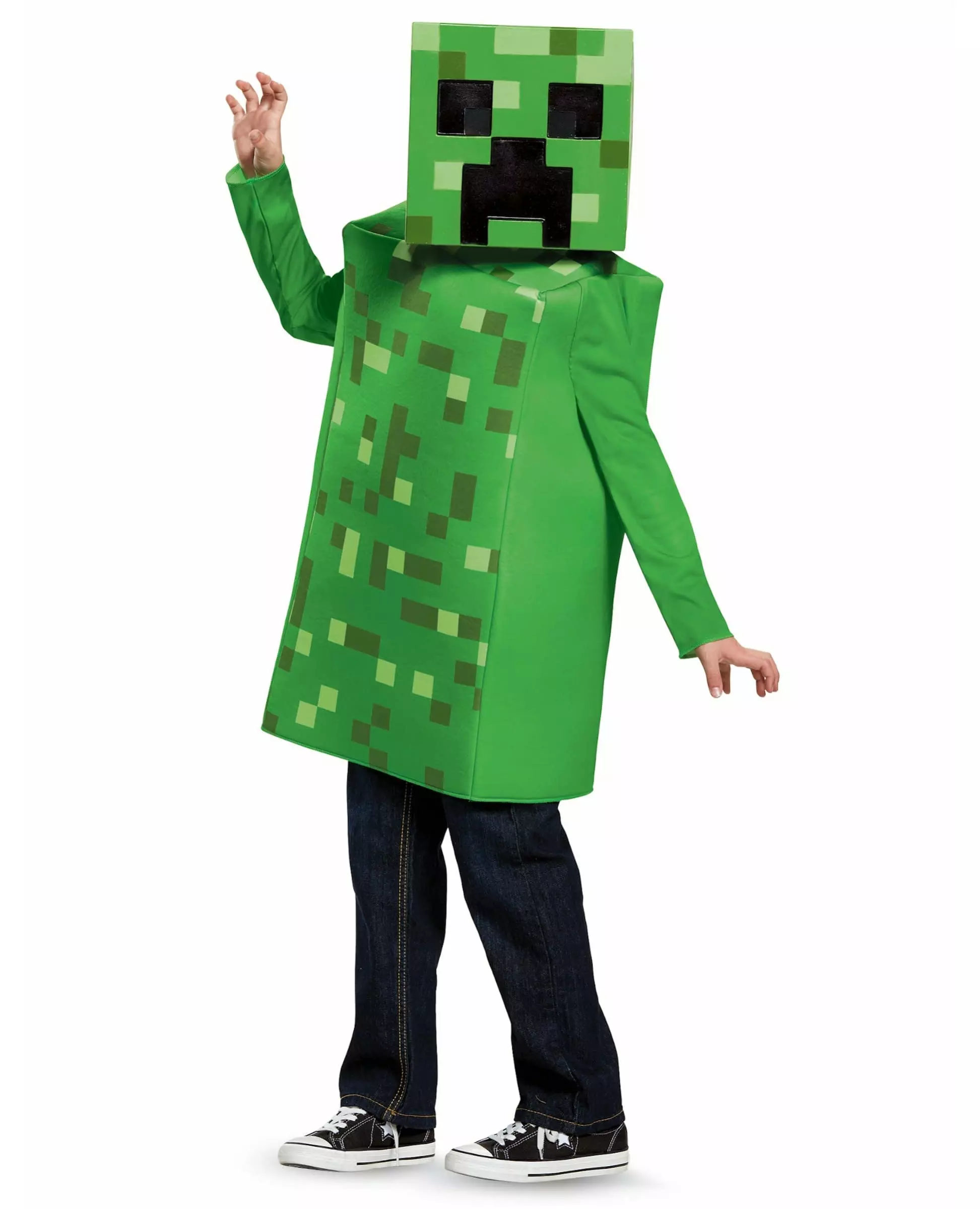 Vær forsiktig så du ikke eksploderer med dette Creeper-kostymet! Dette Creeper-kostymet for barn er offisielt lisensiert av Minecraft™. Det består av en tunika og en maske (bukser og sko er ikke inkludert). Masken forestiller hodet til en firkantet, grønn Creeper og ser ut til å være laget av piksler. Den måler omtrent 27 x 27 cm, og det er et nett i øyehøyde slik at man kan se gjennom det. Tunikaen har lange ermer, den forestiller et grønt rektangel som masken og går fra skuldrene til over knærne. Dette Minecraft™ Creeper-kostymet vil være perfekt for en videospillkveld eller et karneval! Inkludert tilbehør: Tunikamaske Materiale: 100 % polyester Stell: Håndvask
