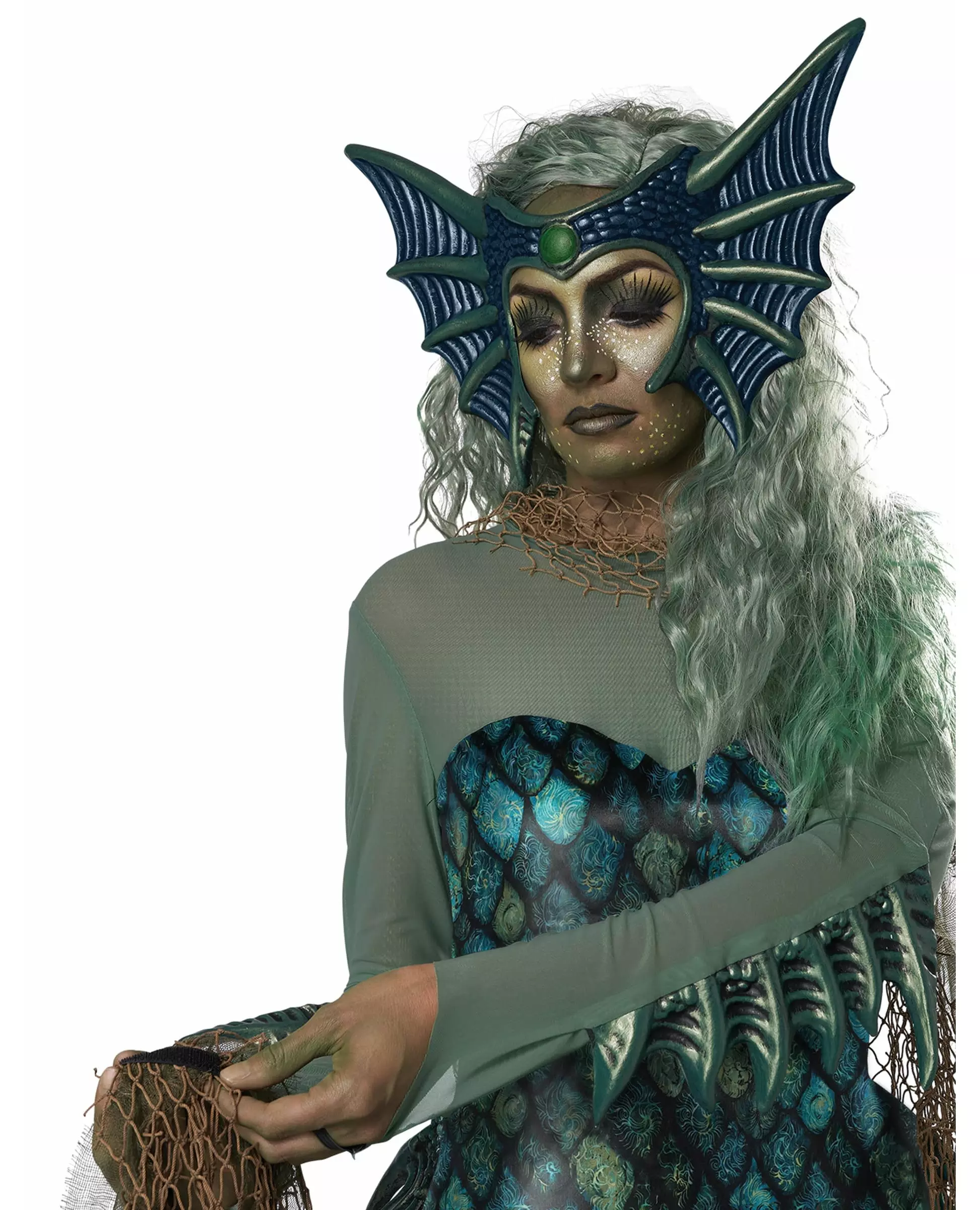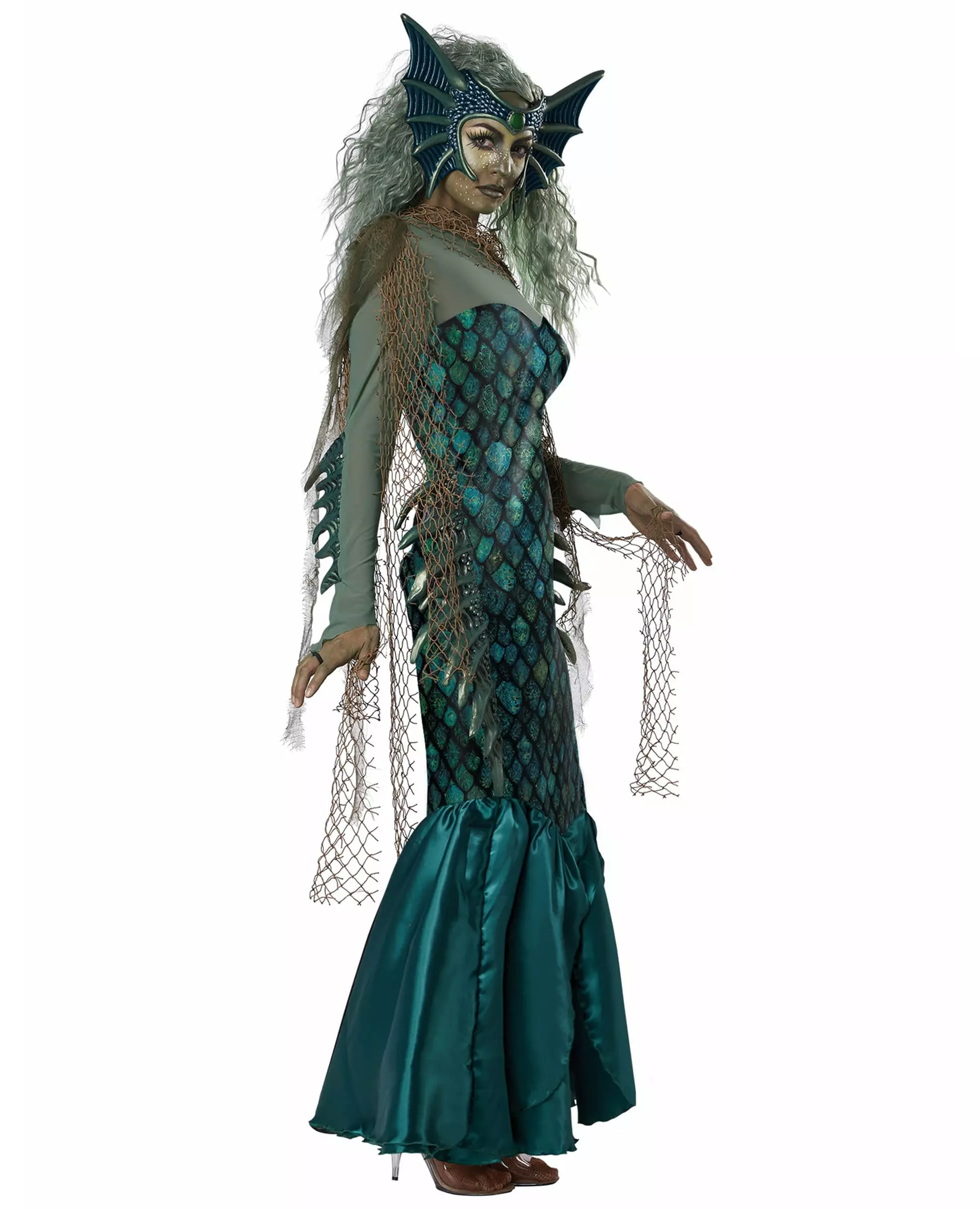 Led sjømennene ned i dypet med dette onde havfruekostymet for kvinner! Dette onde havfruekostymet er for kvinner, det inkluderer kjole, hodeplagg og nett (sminke, parykk og sko ikke inkludert). Den lange petrolblå kjolen har skjellmønstre på forsiden. Skjell kommer ut av kjolen for å vise silhuetten av en ekte havfrue, så det er noen på hoftene og på toppen av armene. Biter av tyll er arrangert på kjolen så vel som på kragen på kostymet. Du kan fullføre antrekket ditt med hodeplagg som imiterer skjellene til en fisk, det har en grønn edelsten midt på pannen. Dette onde havfruekostymet for kvinner vil være ideelt for din fremtidige Halloween-fest!. Inkludert tilbehør: Kjole Hodeplagg Nett Materiale: 100 % polyester Stell: Håndvask