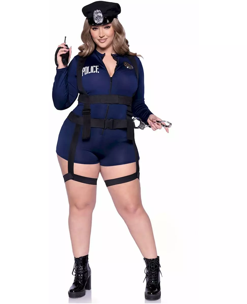 Sexy uniform! Dette politikvinnekostymet er for kvinner og består av en drakt, en kroppssele, et merke, en hatt, en falsk walkie-talkie og et par håndjern. Drakten har lange ermer og er blå. Den har ordet «politi» i hvite bokstaver på brystet. Den har glidelås for enkel påkledning og svarte stropper. Hatten er en mørk caps dekorert med et sølvfarget politimerke. Antrekket kompletteres med et politimerke, en falsk walkie-talkie og et par håndjern. Dette sexy politikvinnekostymet vil være perfekt til Valentinsdagsfesten eller nyttårsaften!. Inkludert tilbehør: Draktmerke Falsk walkie-talkie Håndjern Hatt Kroppssele Materiale: 100 % polyester