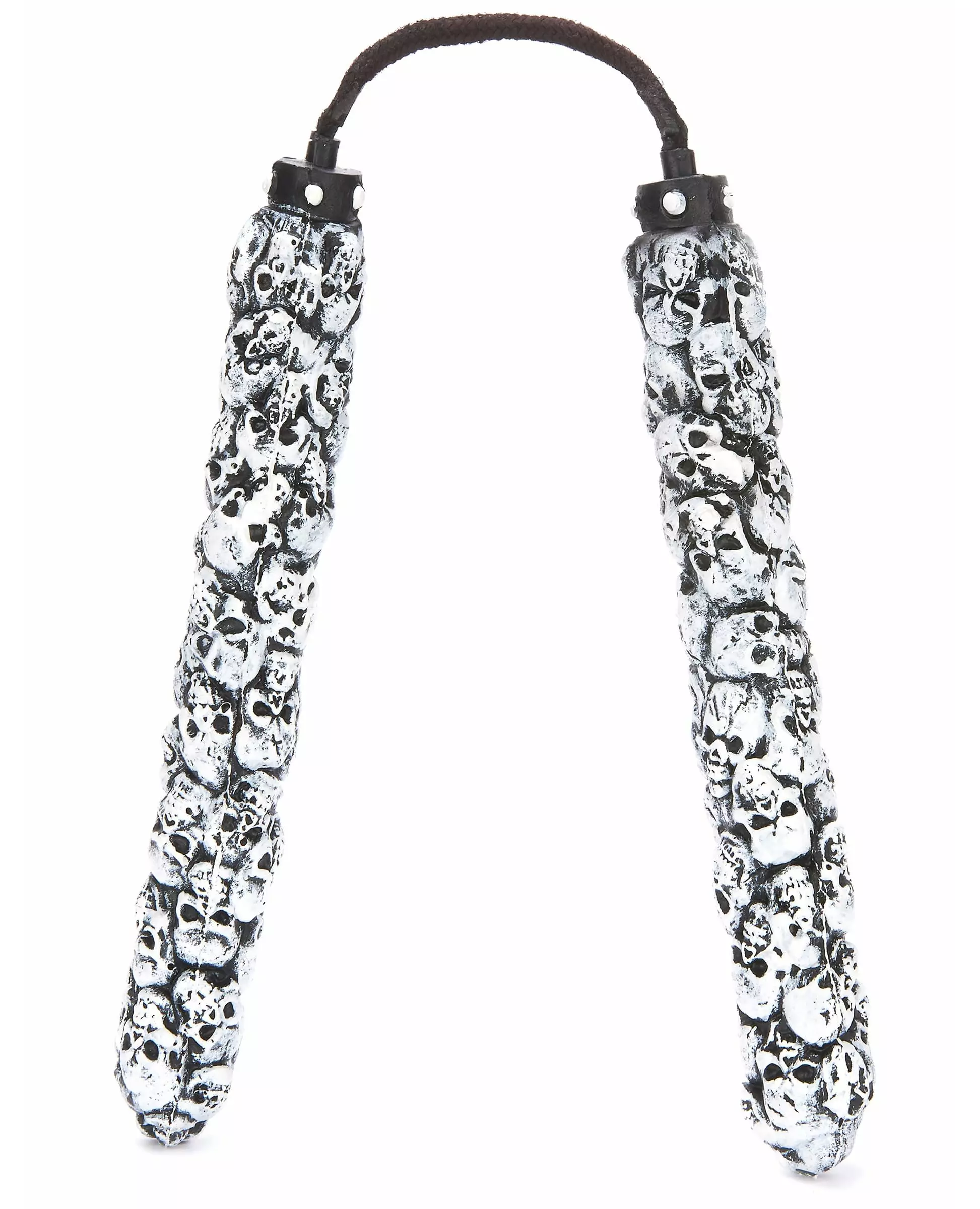 Forbannet ninja! Disse luksuriøse nunchakuene er for voksne. De måler 30 cm hver og er koblet sammen med et svart tau. Laget av polyuretanskum, er de fleksible og derfor trygge. De er preget, prikket med hodeskaller, slik at du vil føle deg som en ekte shinobi. Disse nunchakuene vil være perfekte for å fullføre et apokalyptisk ninjakostyme til karneval eller Halloween. Tilbehør inkludert: Nunchaku