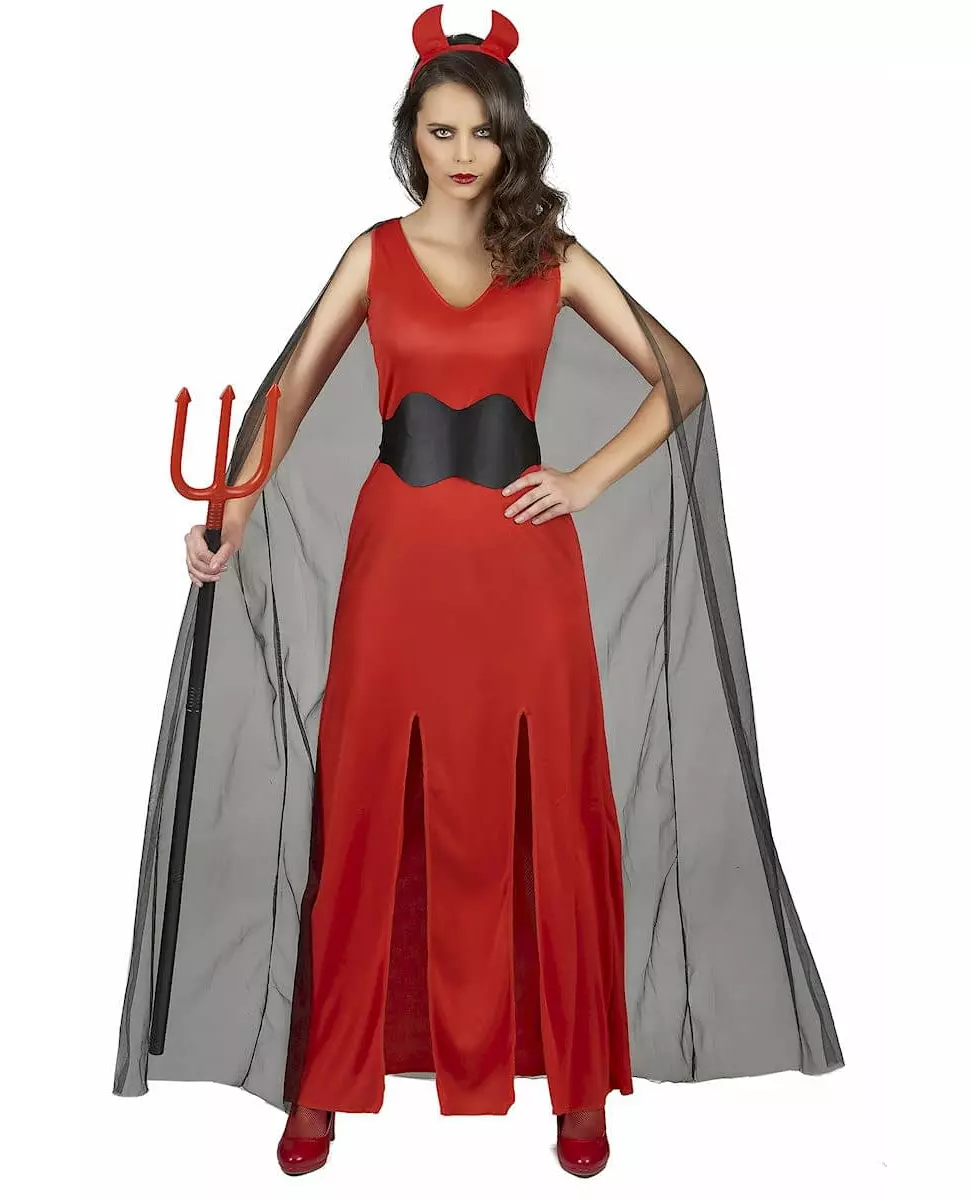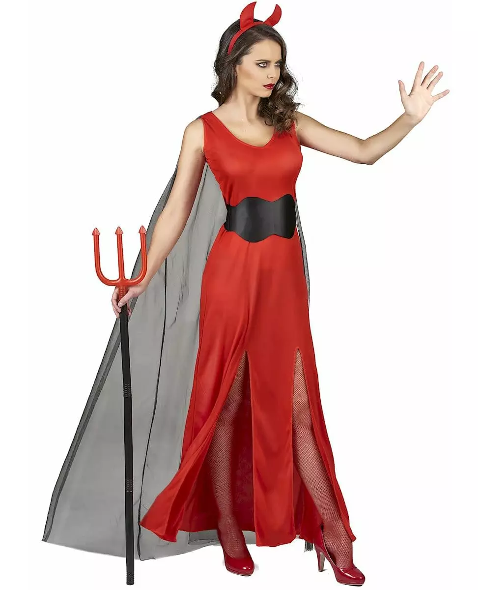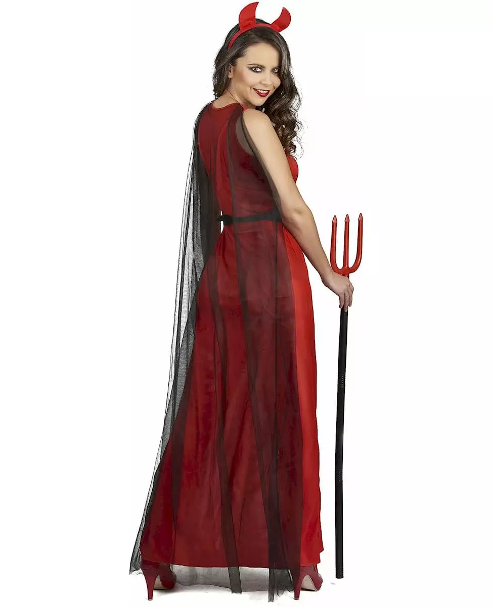 Demonenes dronning Dette demonkostymet for kvinner inkluderer en kjole, et hodeplagg og et belte (septer, sko og strømpebukser er ikke inkludert). Den lange kjolen, i en vakker, knallrød farge, har splitt på to steder foran. På skuldrene er det sydd en svart tyllkappe (ikke avtagbar) som vil bevege seg jevnt med hver av bevegelsene dine. Midjen din vil bli preget av et tykt, svart filtbelte. Og hva ville en demon vært uten hornene sine? Tilbehøret er et rødt pannebånd toppet med to røde filthorn. Dette svært estetiske settet vil være perfekt for å være demonisk under Halloween-festen din!. Inkludert tilbehør: Pannebåndkjole med kappe Belte Materiale: 100 % polyester Stell: Håndvaskbar
