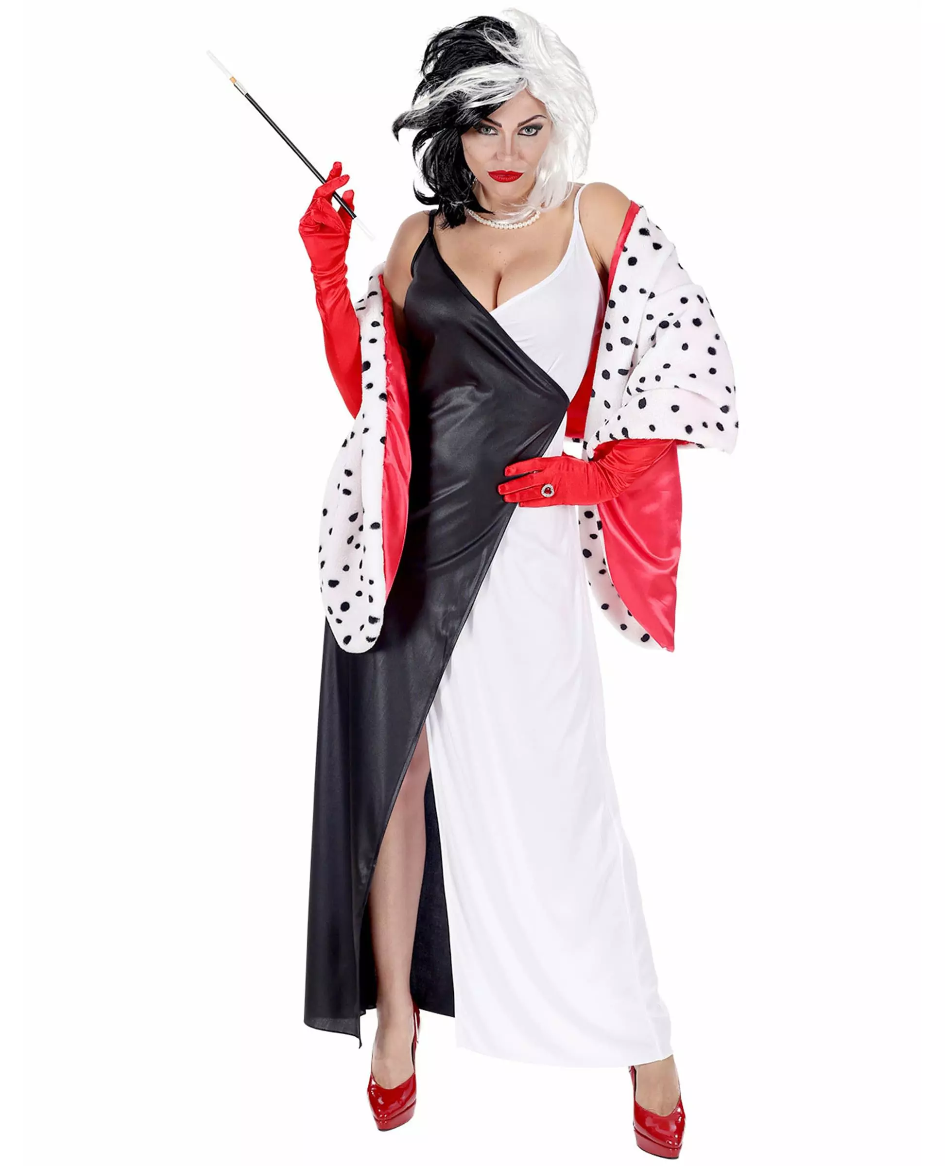 Legemliggjør en demonisk kvinne med en spesiell interesse for hundepels ... Dette demoniske kvinnekostymet inkluderer kjole og bolero (sko, hansker, sigarettholder og parykk er ikke inkludert). Kjolen er lang i svart og hvit, åpen foran for enkel bevegelse. Boleroen er hvit med dalmatiske prikker, baksiden er rød. Med en tofarget svart og hvit parykk som følger med dette demoniske kvinnekostymet, vil du se ut som to dråper vann for den berømte tegneserieskurken dalmatiske jegeren ... Tilbehør inkludert: Kjole, Bolero Materiale: 100 % polyester Vedlikehold: Håndvask