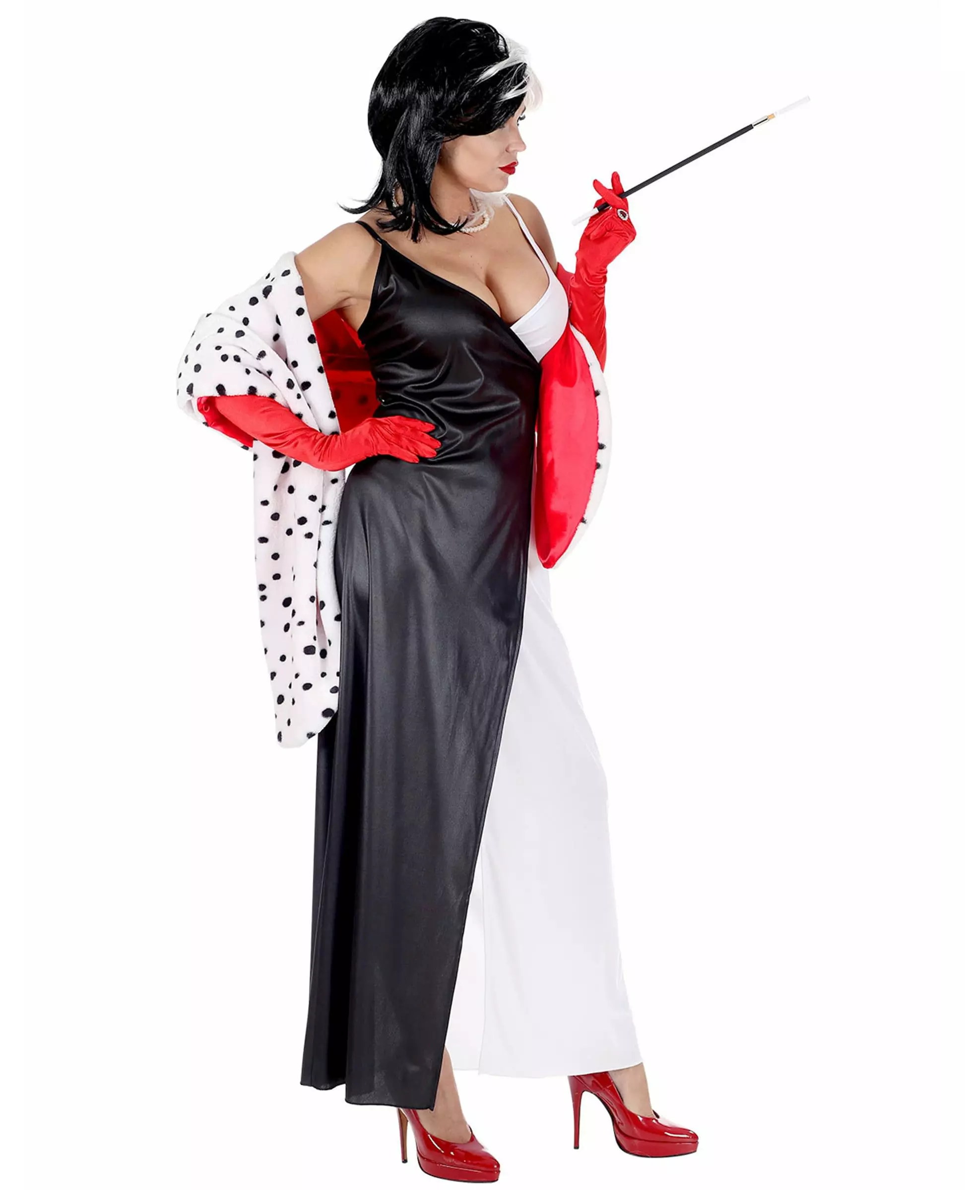 Legemliggjør en demonisk kvinne med en spesiell interesse for hundepels ... Dette demoniske kvinnekostymet inkluderer kjole og bolero (sko, hansker, sigarettholder og parykk er ikke inkludert). Kjolen er lang i svart og hvit, åpen foran for enkel bevegelse. Boleroen er hvit med dalmatiske prikker, baksiden er rød. Med en tofarget svart og hvit parykk som følger med dette demoniske kvinnekostymet, vil du se ut som to dråper vann for den berømte tegneserieskurken dalmatiske jegeren ... Tilbehør inkludert: Kjole, Bolero Materiale: 100 % polyester Vedlikehold: Håndvask