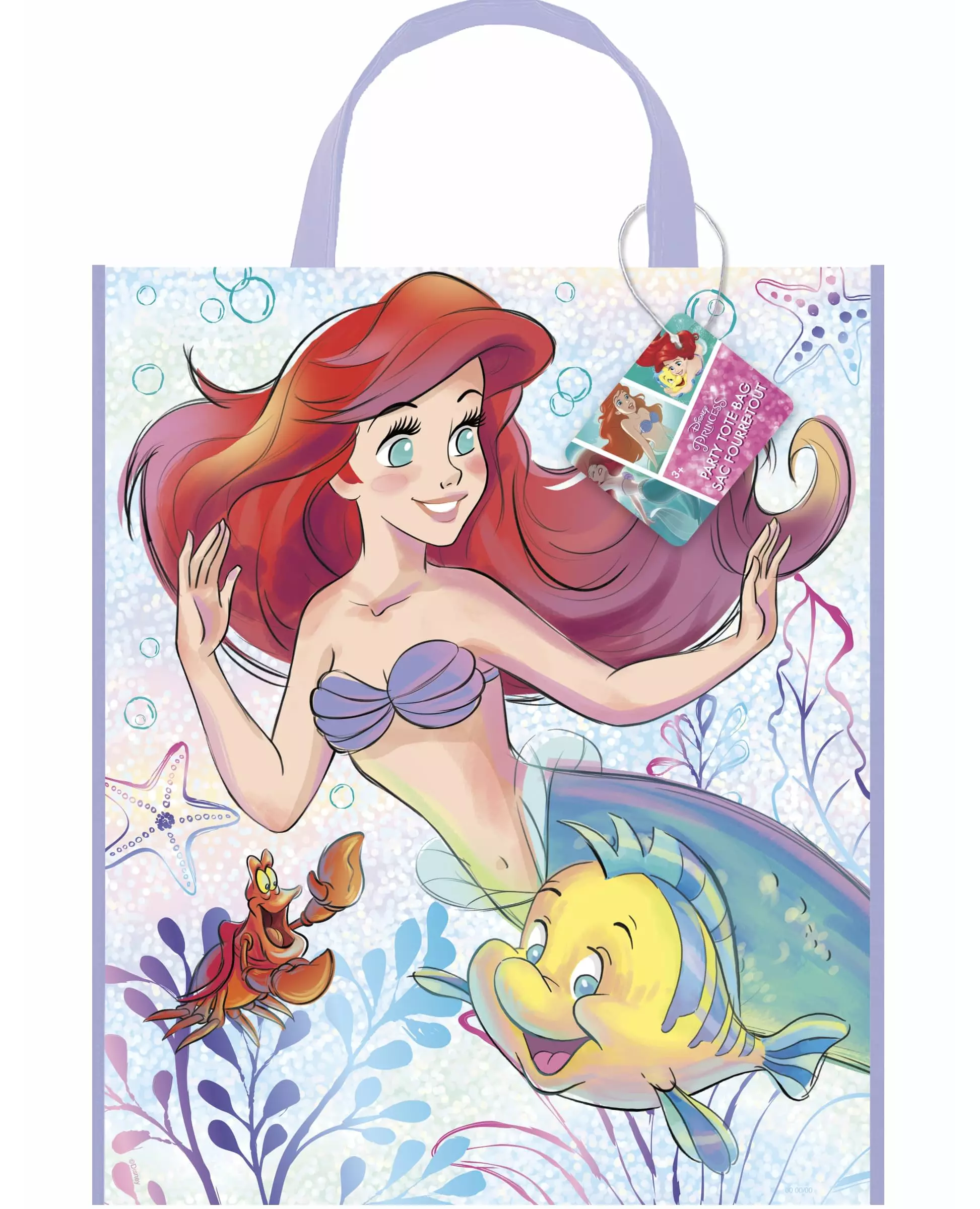 En gave med Den lille havfruen! Denne offisielt lisensierte gaveposen fra Den lille havfruen måler omtrent 33 x 28 cm. Den er laget av plast med lilla kanter og håndtak. Den forestiller prinsesse Ariel og vennene hennes Flyndre og Sebastian som svømmer i havet. Du kan fylle denne gaveposen fra Den lille havfruen med godbiter og små leker til bursdagsgjestene dine. Inkludert tilbehør: 1 pose Materiale: Plast