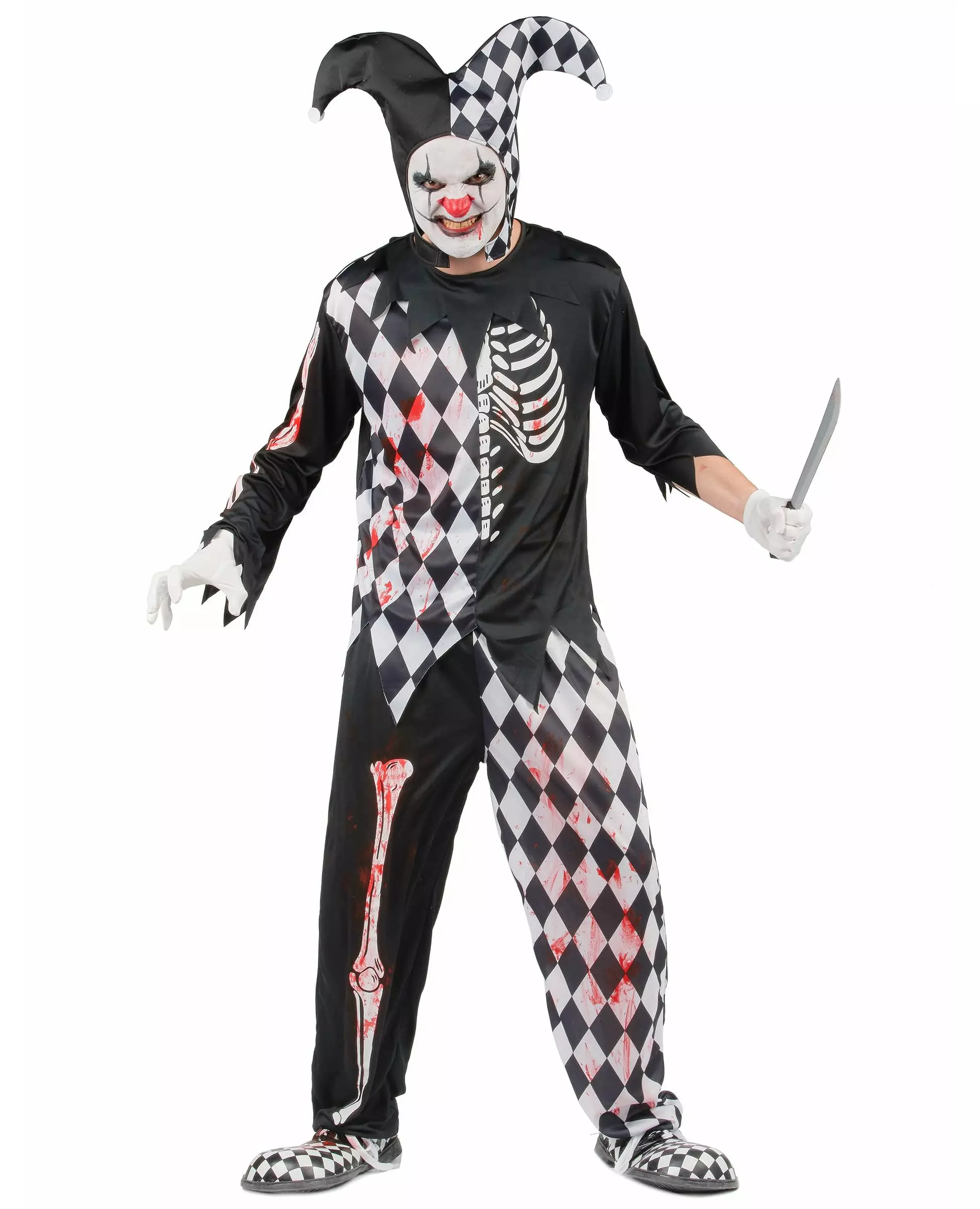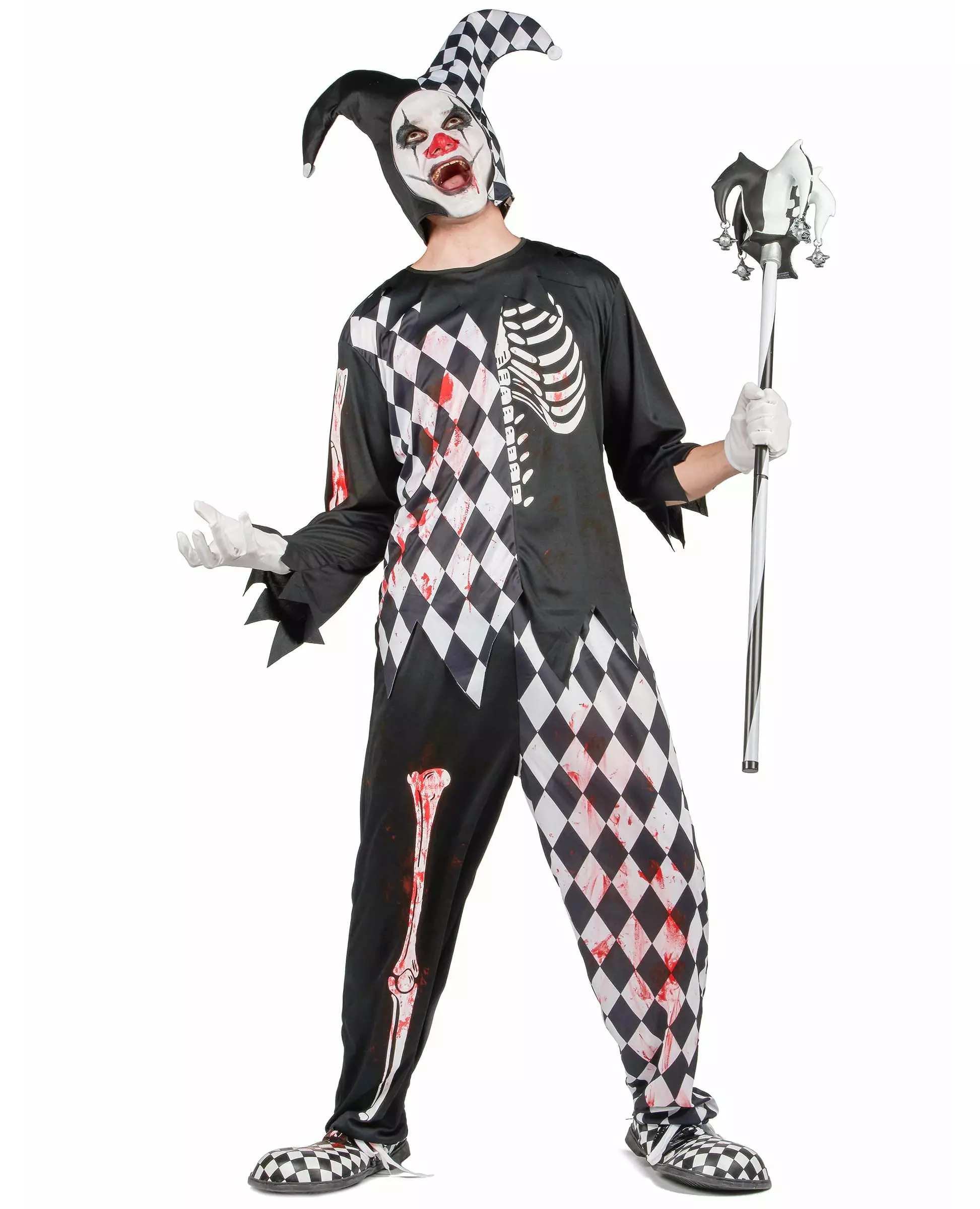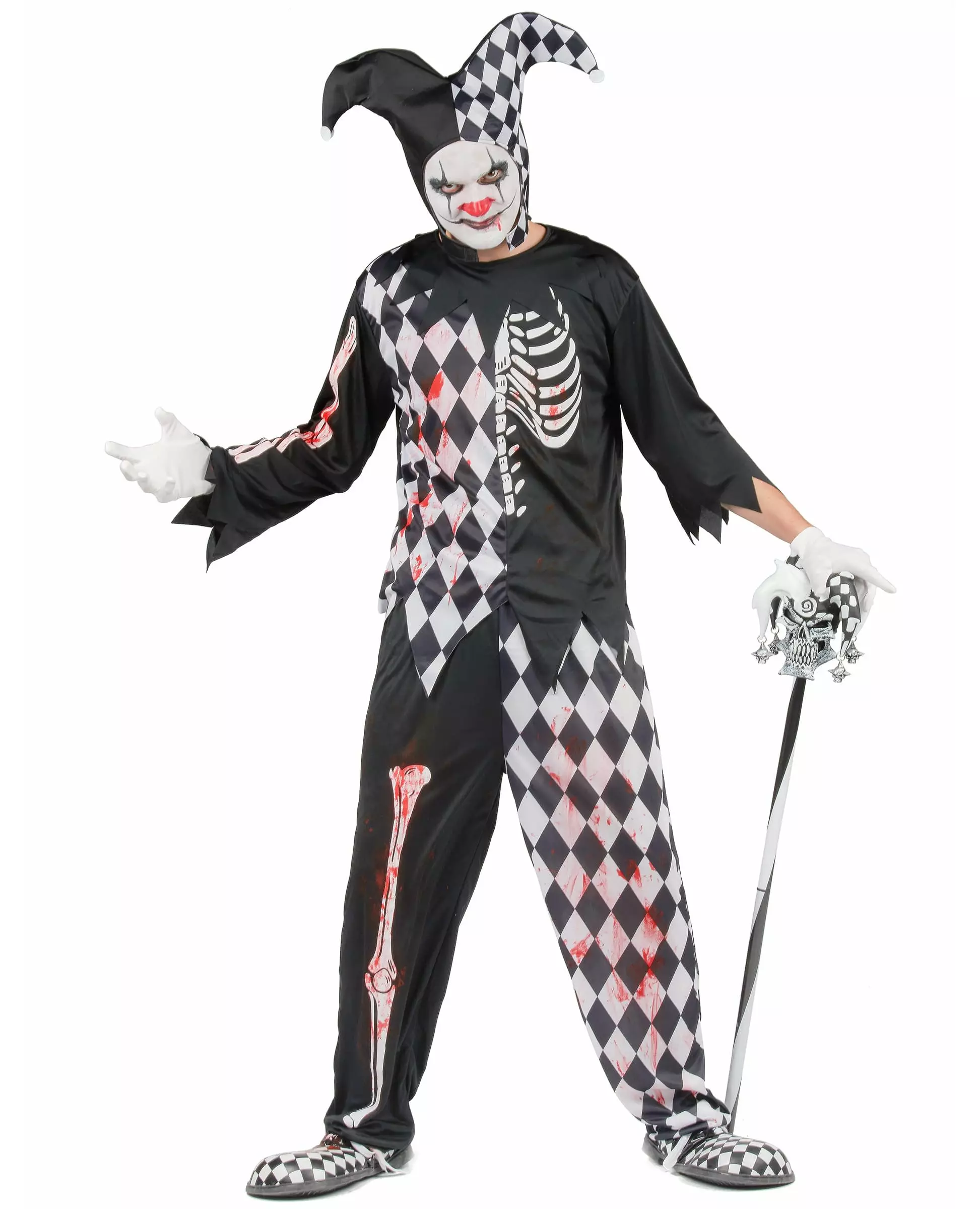 Denne Halloween-helgen kan du forvandle deg til en blodig harlekin! Dette harlekinkostymet for menn består av en tunika, bukser og en hatt (stokk ikke inkludert). Toppen er svart med et skjeletttrykk på den ene halvdelen av brystet og den ene armen. Den a
