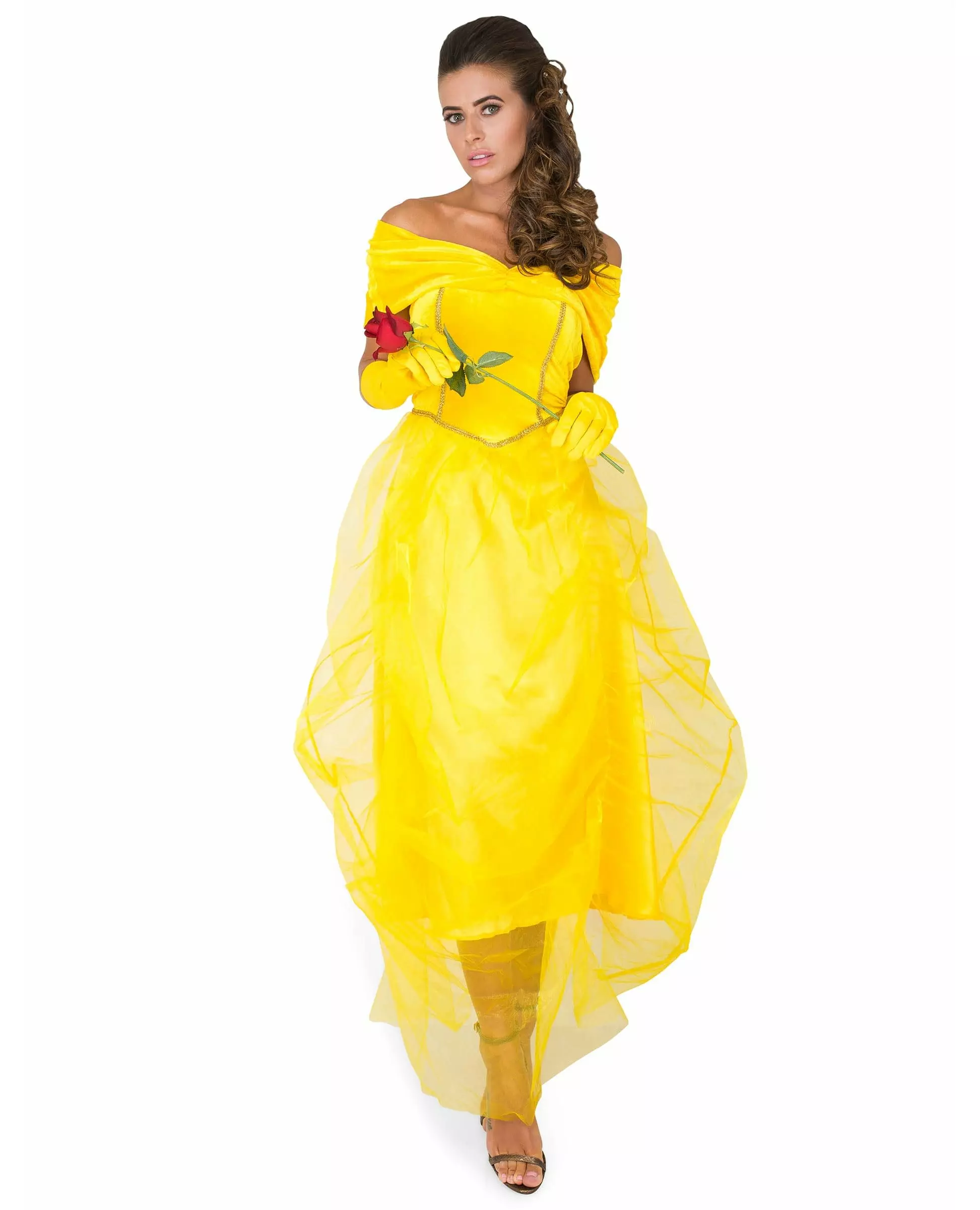 En veldig vakker kjole! Dette vakre prinsessekostymet for kvinner består av en kjole og et par hansker. Den gule kjolen er lang med bandeauermer for bare skuldre. Nederst på kjolen har et pent gult tyllslør. Hanskene er lange og gule for å matche kjolen. Denne kjolen vil være ideell for å være den vakreste på en kostymefest med venner! Inkludert tilbehør: Kjole 2 hansker Materiale: 100 % polyester Pleie: Håndvask