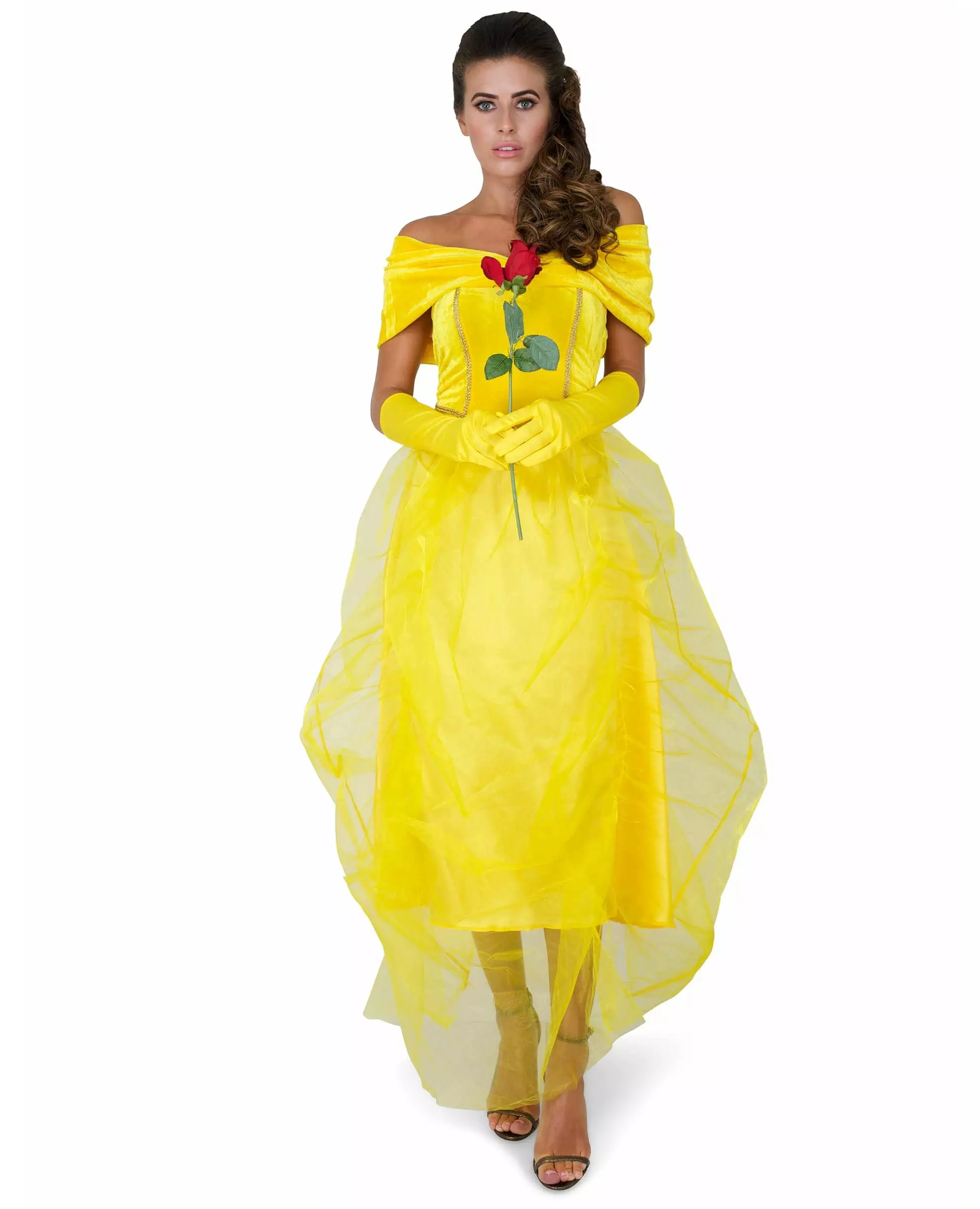 En veldig vakker kjole! Dette vakre prinsessekostymet for kvinner består av en kjole og et par hansker. Den gule kjolen er lang med bandeauermer for bare skuldre. Nederst på kjolen har et pent gult tyllslør. Hanskene er lange og gule for å matche kjolen. Denne kjolen vil være ideell for å være den vakreste på en kostymefest med venner! Inkludert tilbehør: Kjole 2 hansker Materiale: 100 % polyester Pleie: Håndvask